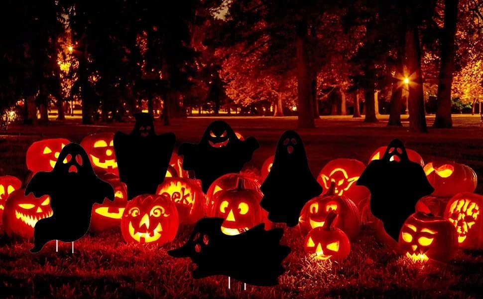 - садовые персонажи «Страшная вечеринка с призраками»: содержит 6 устойчивых к погоде черных пластиковых персонажей и 12 сплошных ставок, которые нужно положить. Фигуры Хэллоуина водонепроницаемы.