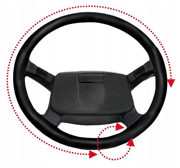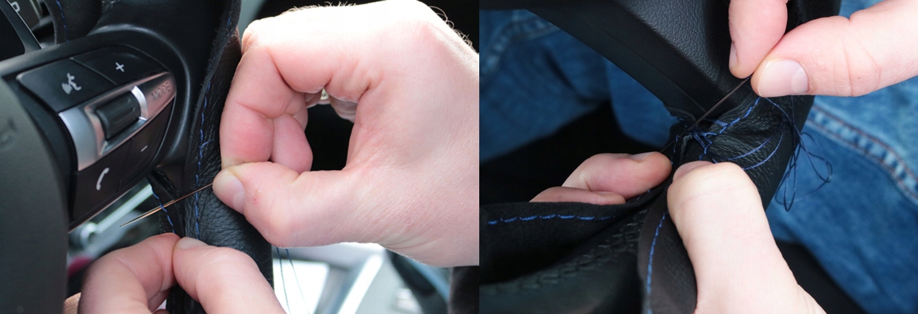 1. Поместите чехол на руль так, чтобы кожаный шарнир находился внизу и посередине рулевого колеса. Чехол шьется от плеча до плеча, предварительно отмерьте подходящую длину нитки, входящей в комплект. Это примерно в два раза длиннее пришиваемого участка, т.е. от плеча до плеча.