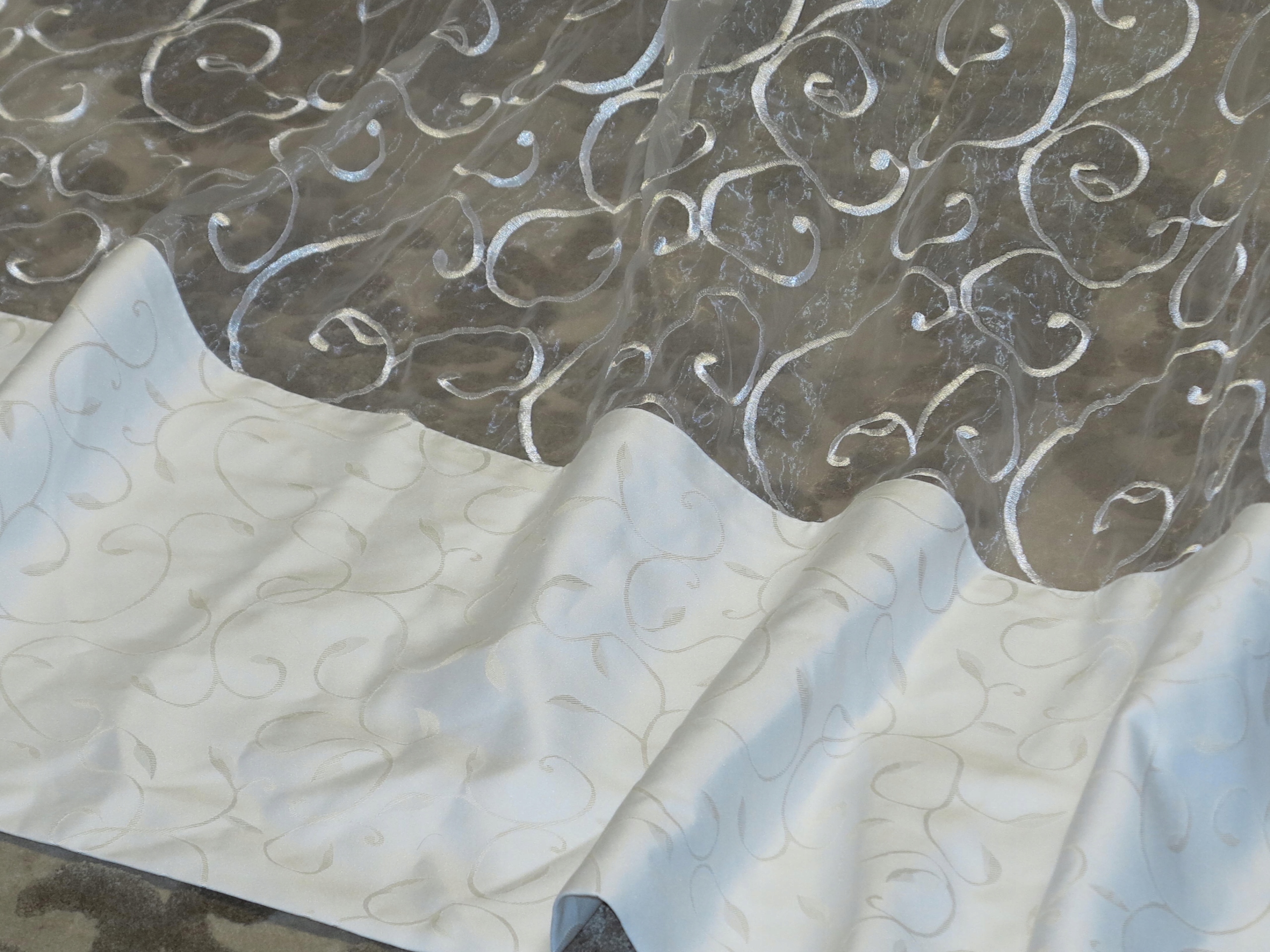 КРАСИВАЯ СНЕЖНО-БЕЛАЯ ШТОРА С ВЫШИТЫМИ УЗОРАМИ С ОБЕИХ СТОРОН, ШИРОКАЯ ДЕКОРАТИВНАЯ ПОЛОСКА ИЗ ИЗ ВНИЗУ ДВОЙНОЙ СЛОЙ АТЛАСНОЙ ТКАНИ, ТО ЖЕ УЗКИЙ СВЕРХУ