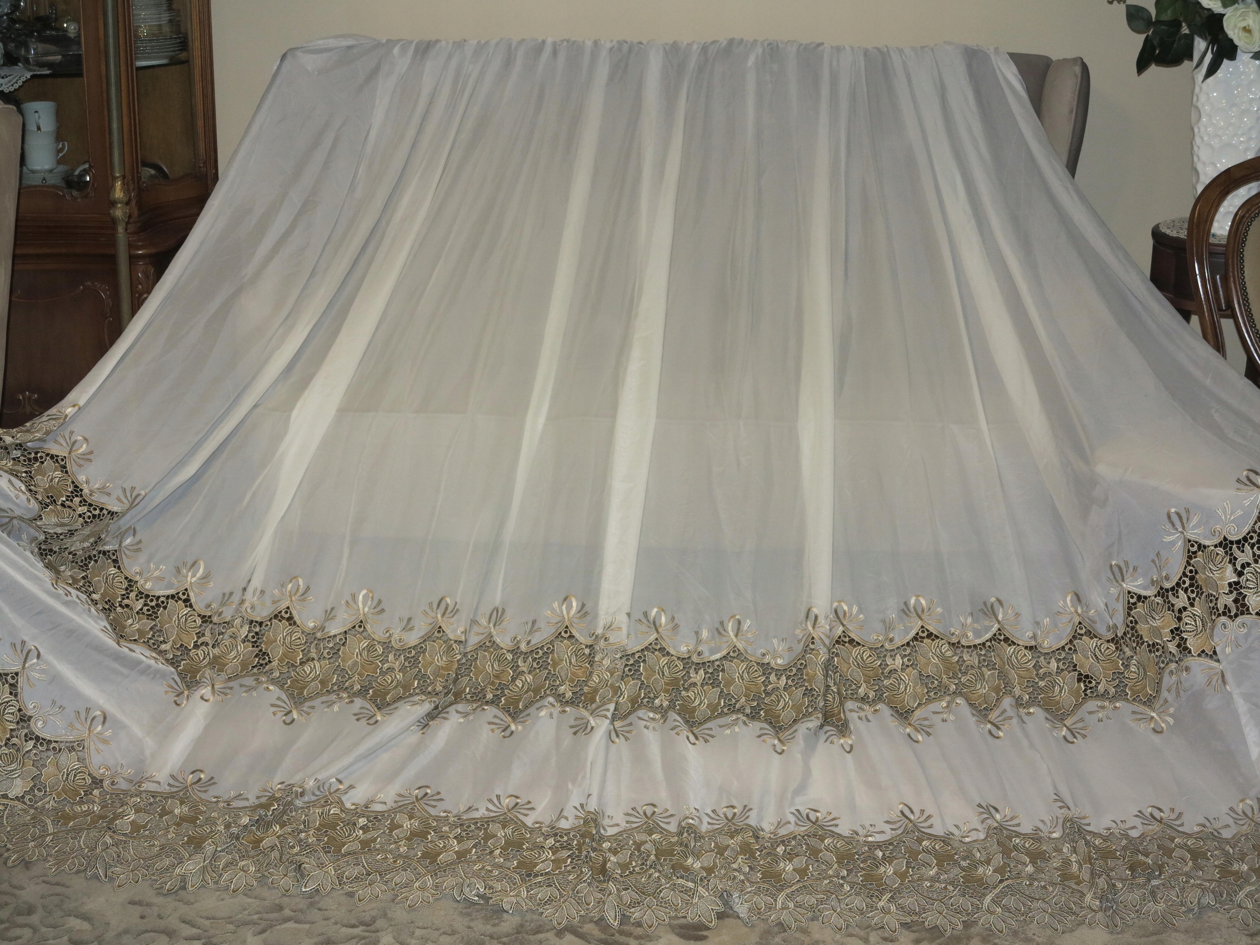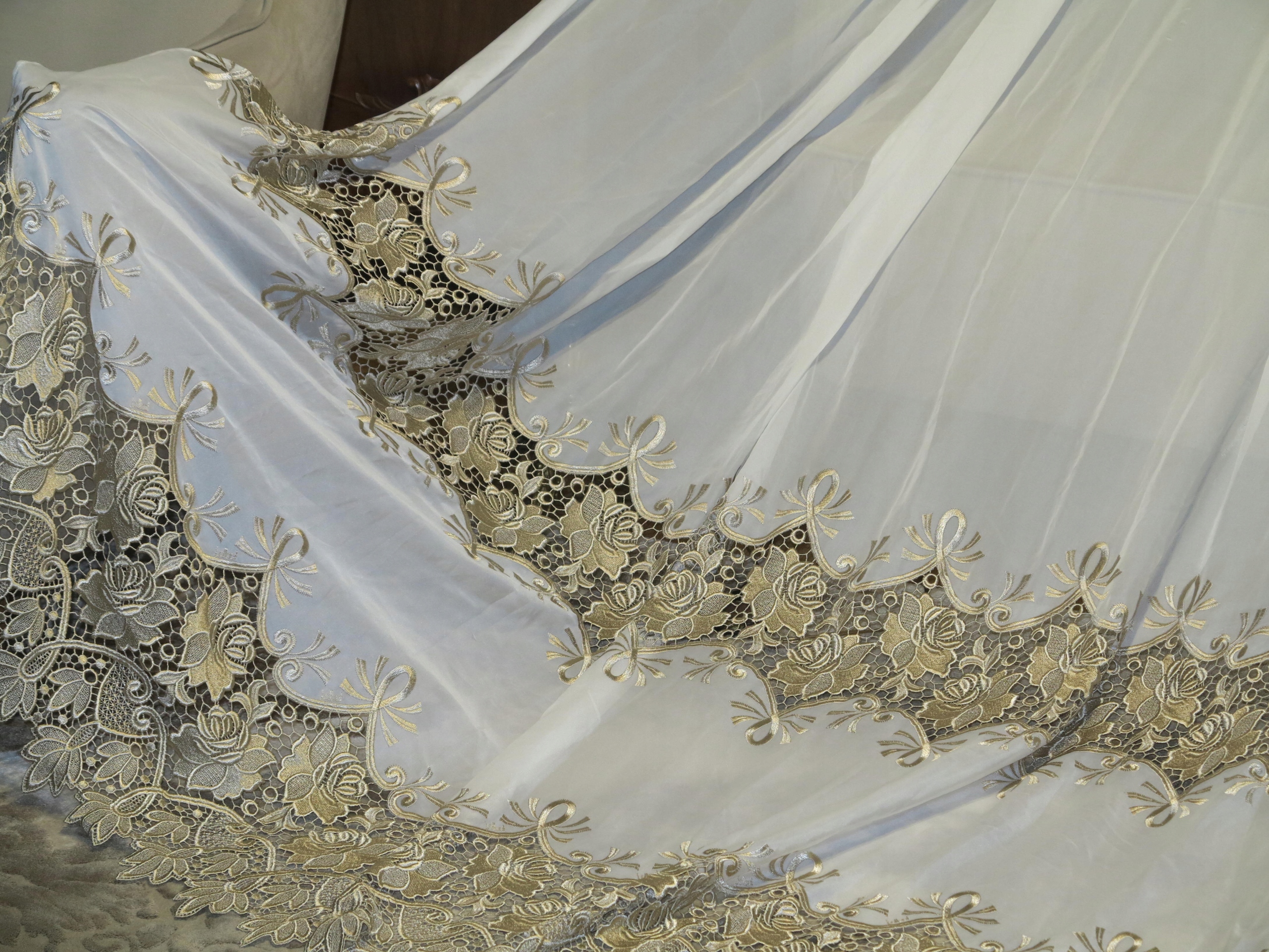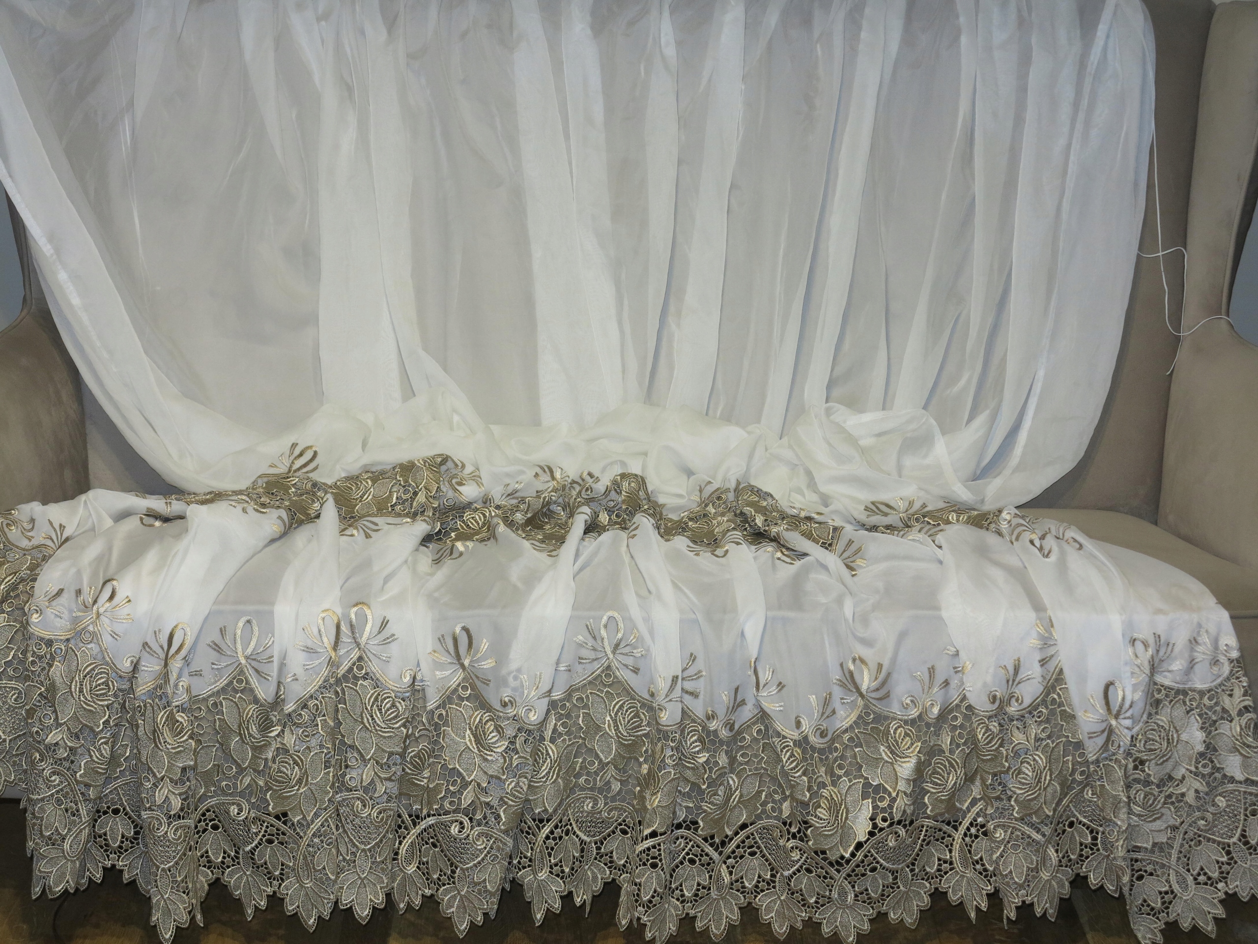 КРАСИВУЮ БЕЛУЮ ШТОРУ ВНИЗУ С НАСЫЩЕННЫМ ГИПЮРОМ ЦВЕТА БЕЖЕВОГО СТАРОГО ЗОЛОТА