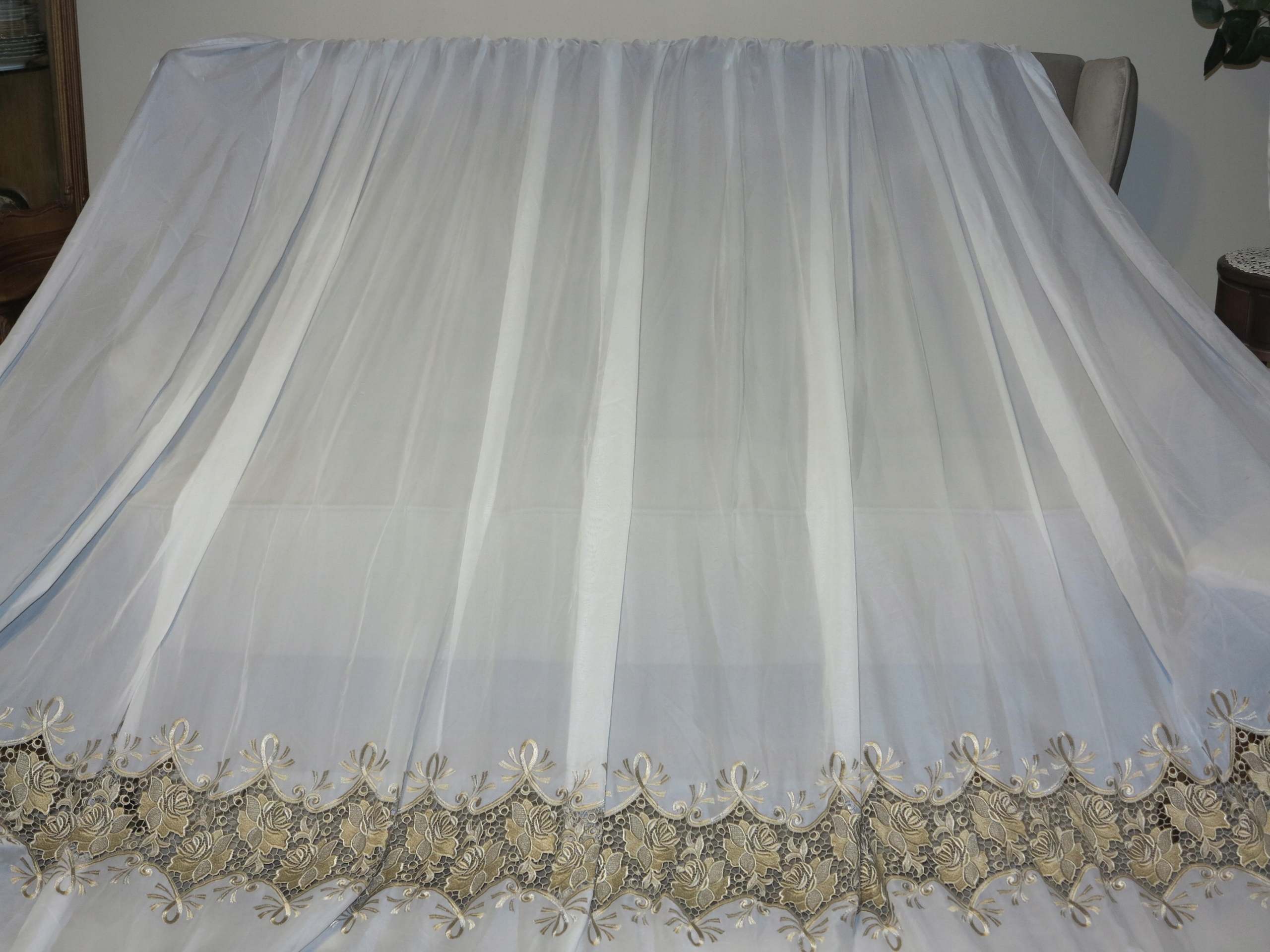 Предмет аукциона – красивая штора с насыщенным гипюром цвета бежевого золота. Тип шторы – мягкий маркизет. В реальности занавеска еще красивее. На сборе ленты. Шторы б/у, в очень хорошем состоянии и качестве. Рекомендую.