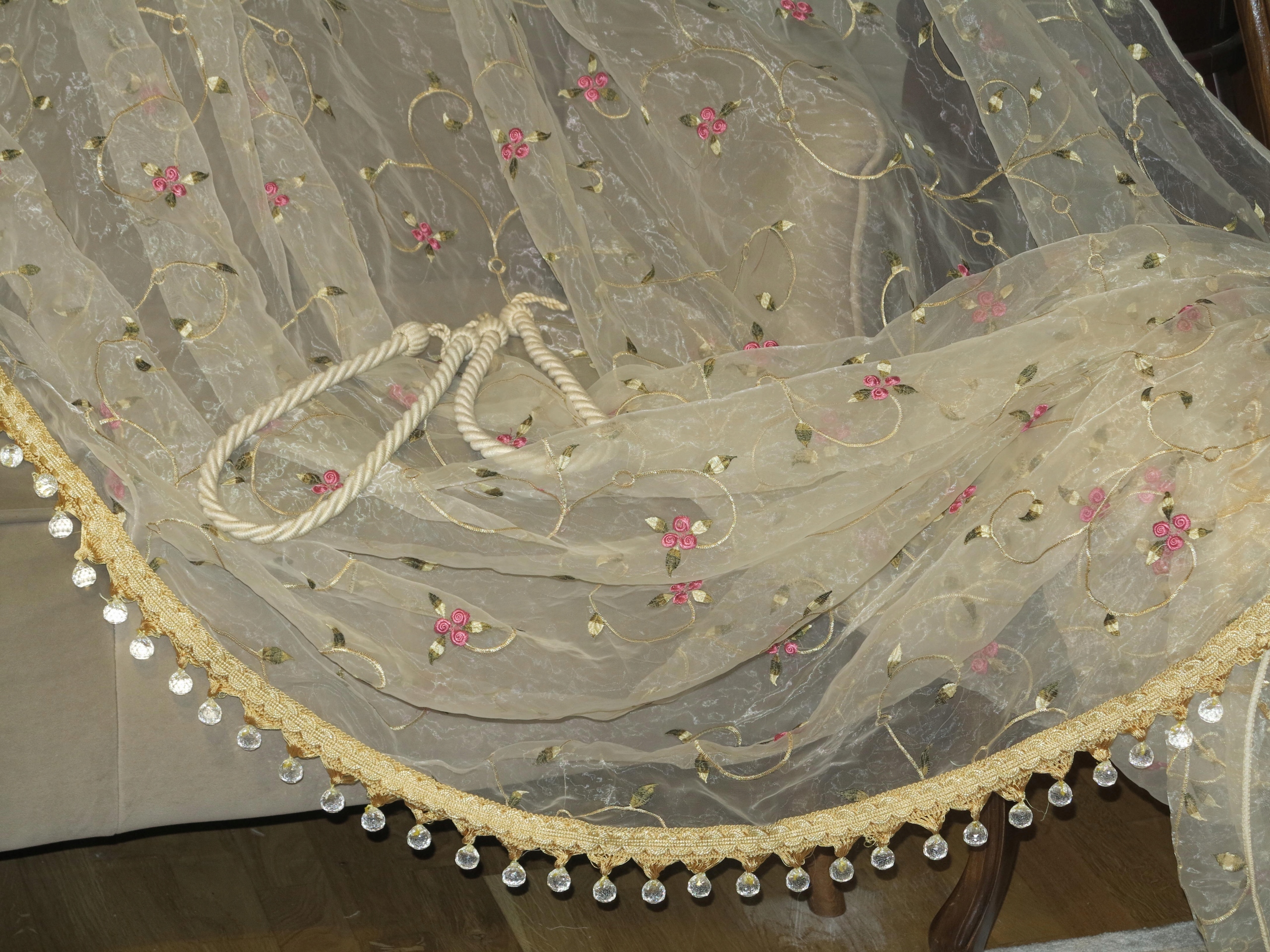 ШТОР С ЗОЛОТОЙ ВЫШИВКОЙ И РОЗАМИ. В КОМПЛЕКТ ВХОДЯТ СТРУНЫ, ПОКАЗАННЫЕ НА ФОТО ДЛЯ СВЯЗКИ.