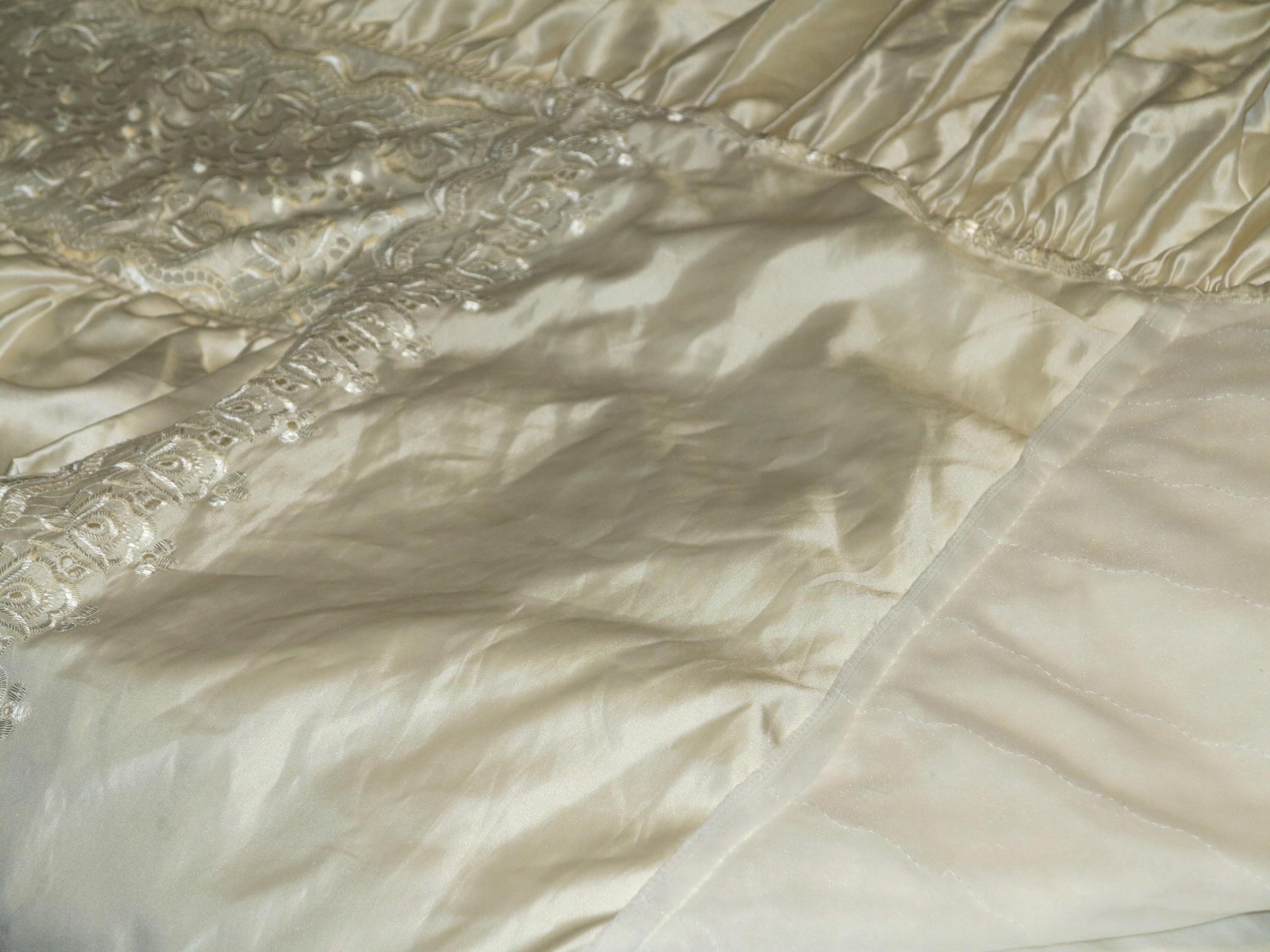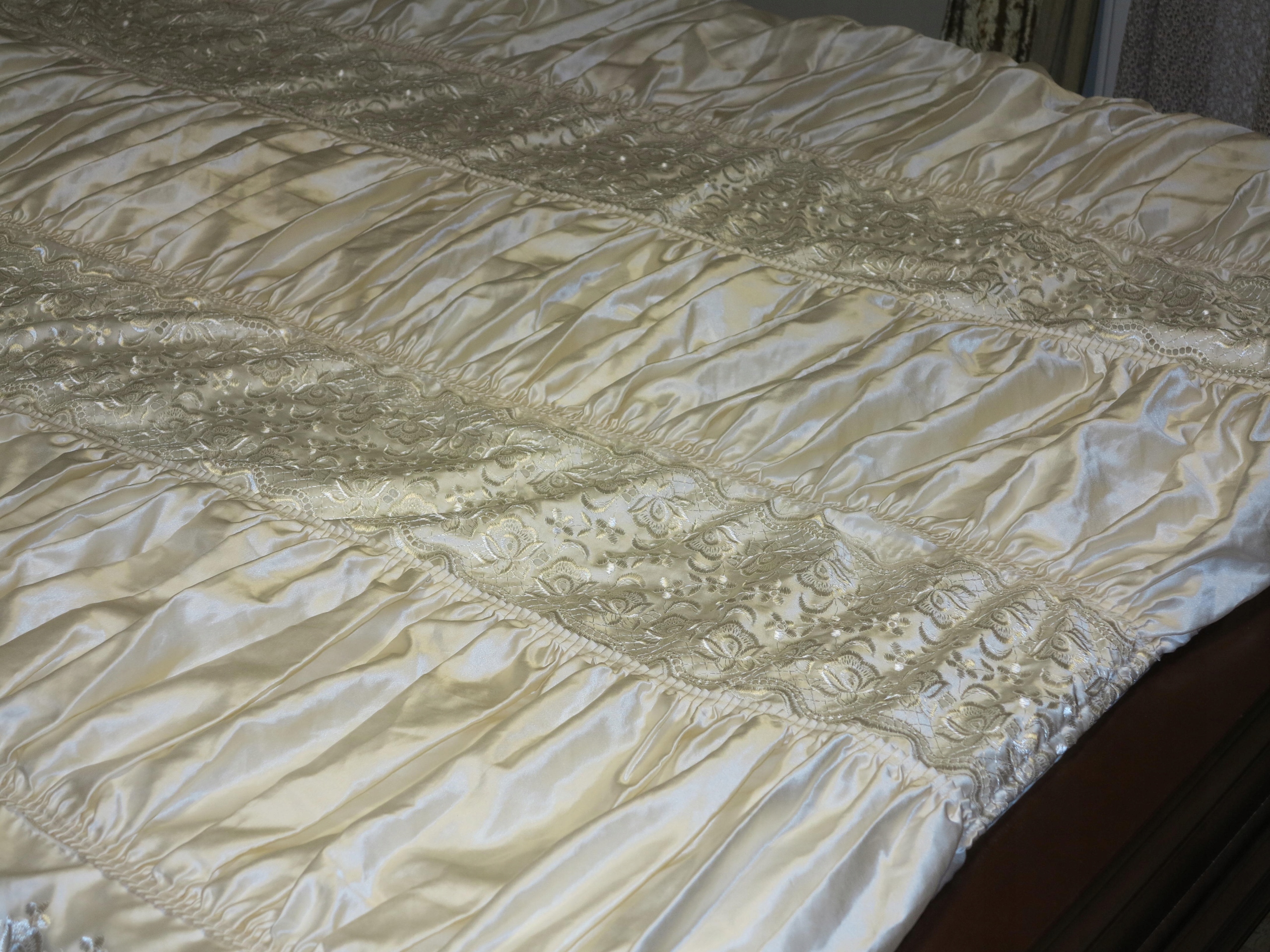 Замечательный и романтический декоративный драпированный атласный переушной рассыпленный, на двух сторонах, также с двойным фарриком также с вышивкой. Цвет экру с жемчужным глянком