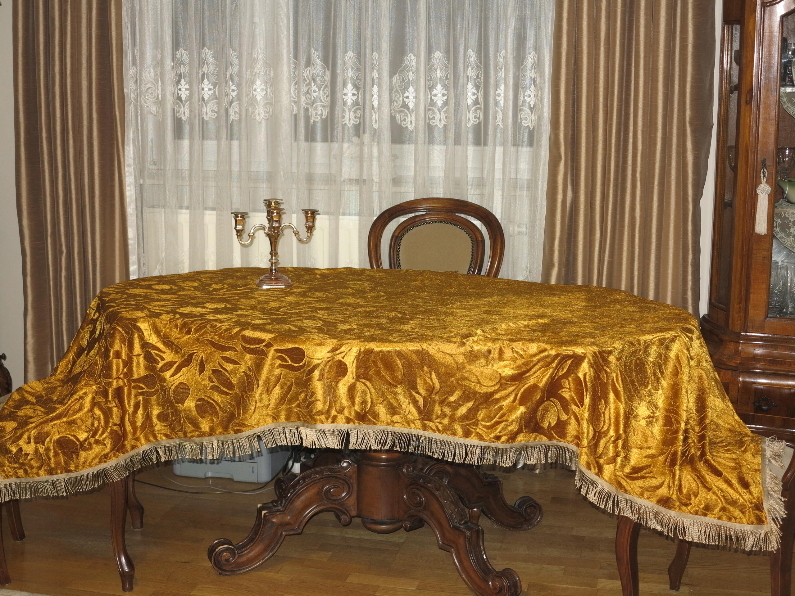 Предмет аукциона – необыкновенно красивая скатерть из велюрового бархата с рельефным цветочным узором, в цвете из темного золота. Скатерть по периметру отделана золотой бахромой. Скатерть на большой стол, размеры: 231/130 см + бахрома примерно 5 см. Скатерть б/у, в очень хорошем состоянии и качестве. Рекомендую, выглядит феноменально.