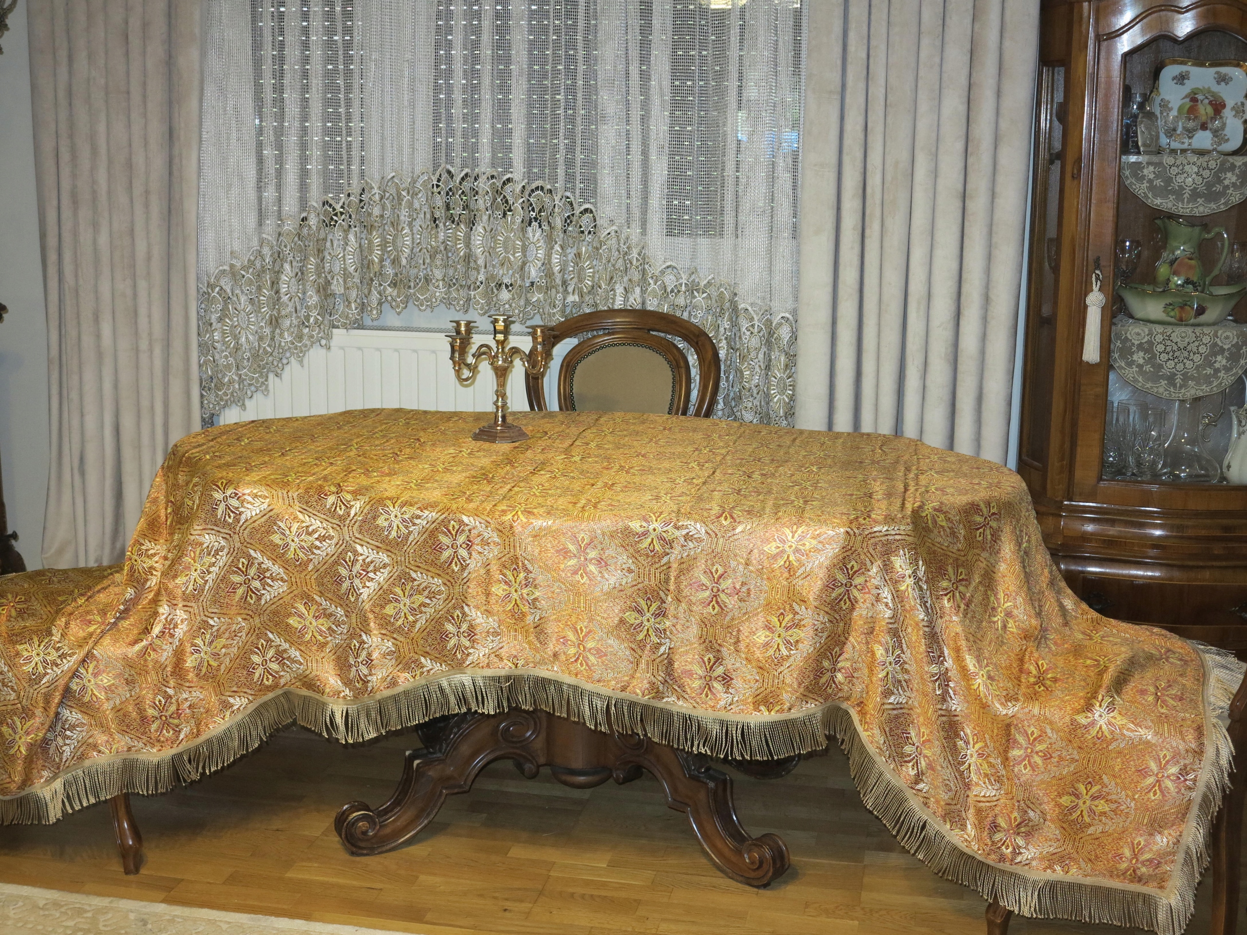 ДЛЯ ЗНАЧИТЕЛЯ - КРАСИВУЮ, СТИЛЬНУЮ, ОГРОМНУЮ СКАТЕРТЬ ИЗ СТРУЮЩЕГО ЖАККАРДА С ШЕЛКОВОЙ НИТЬЮ, В ЗОЛОТЫХ ТОНАХ. УКРАШЕН ЗОЛОТОЙ БАХИРОЙ ВОКРУГ.