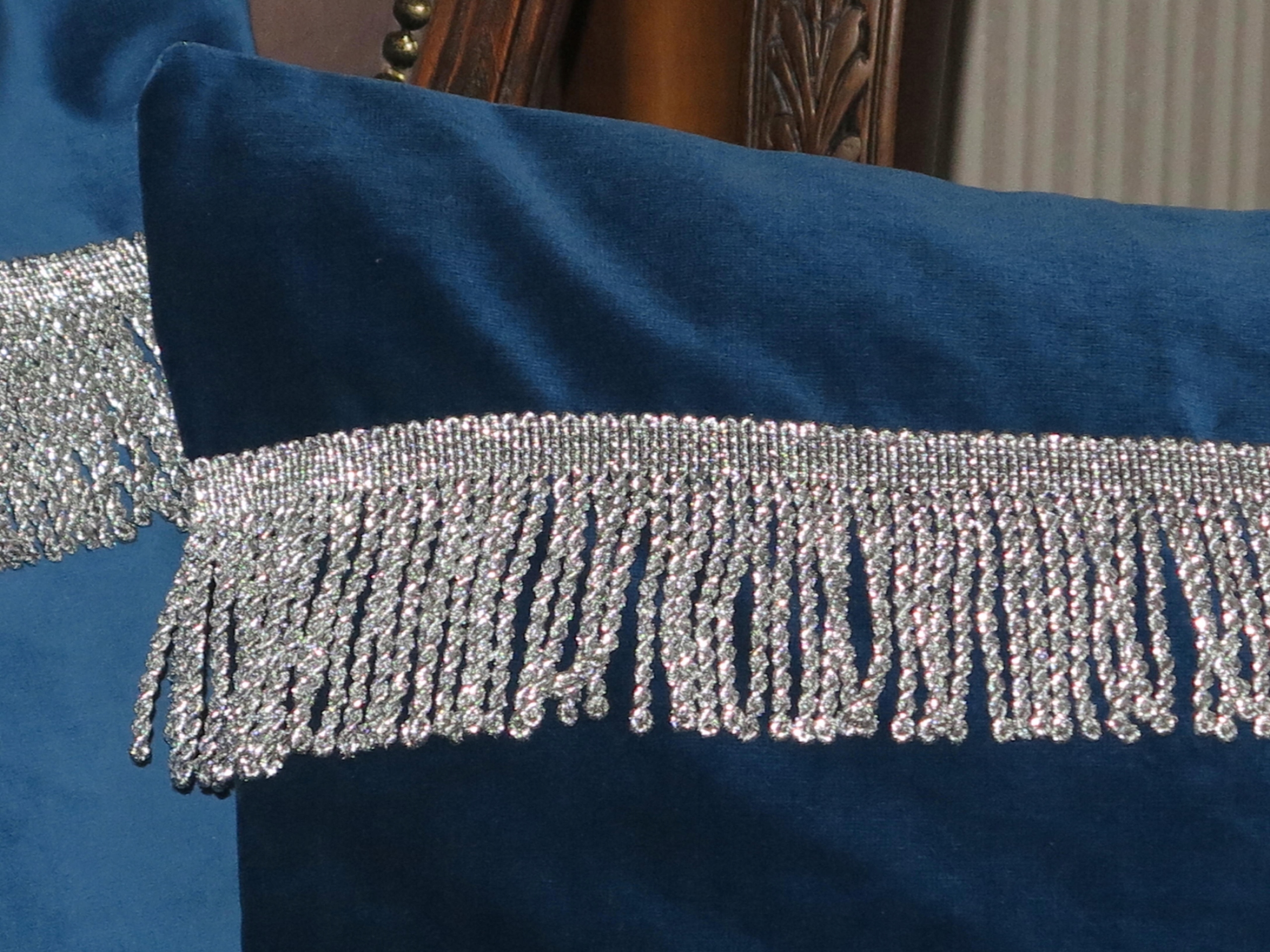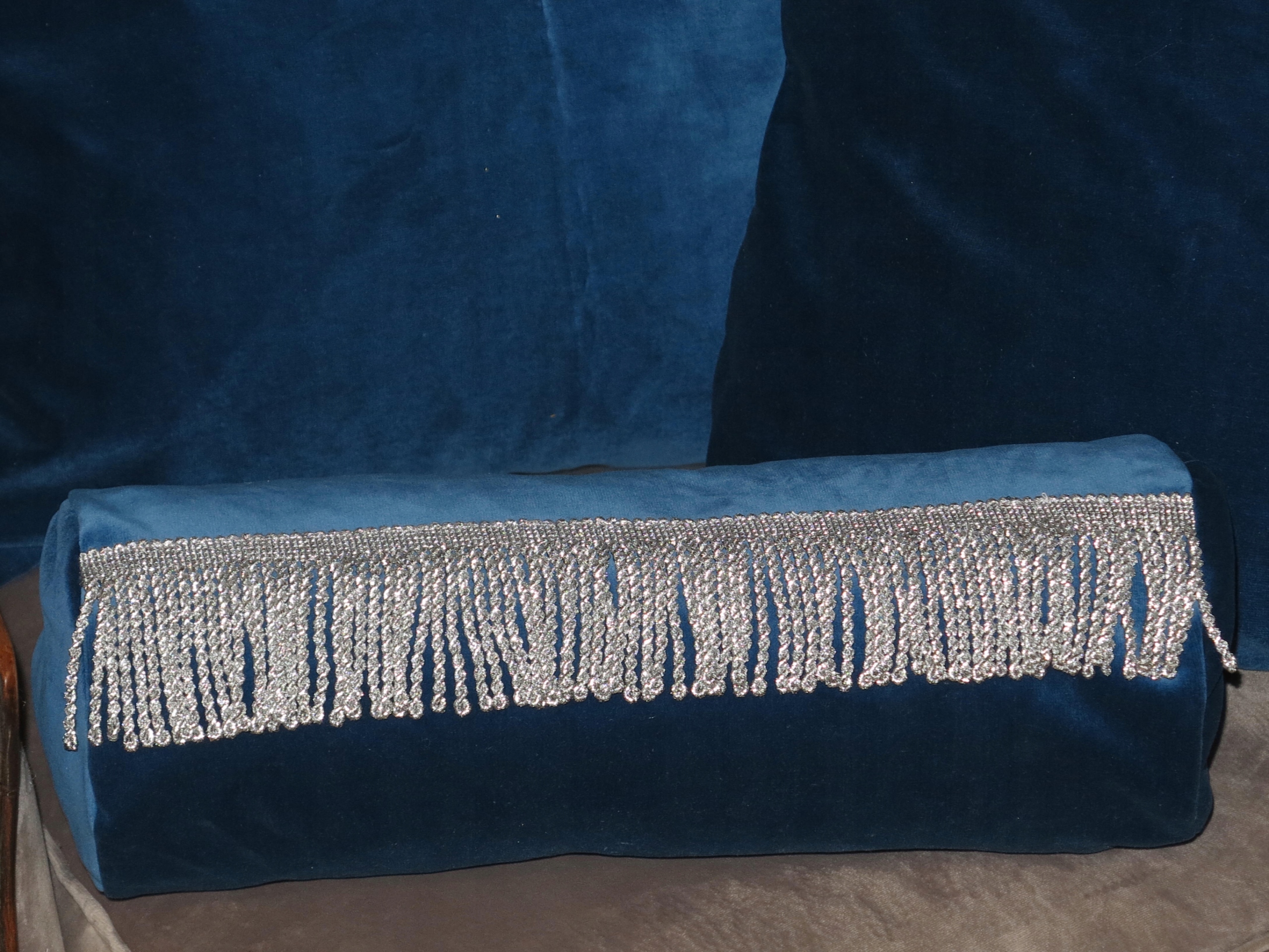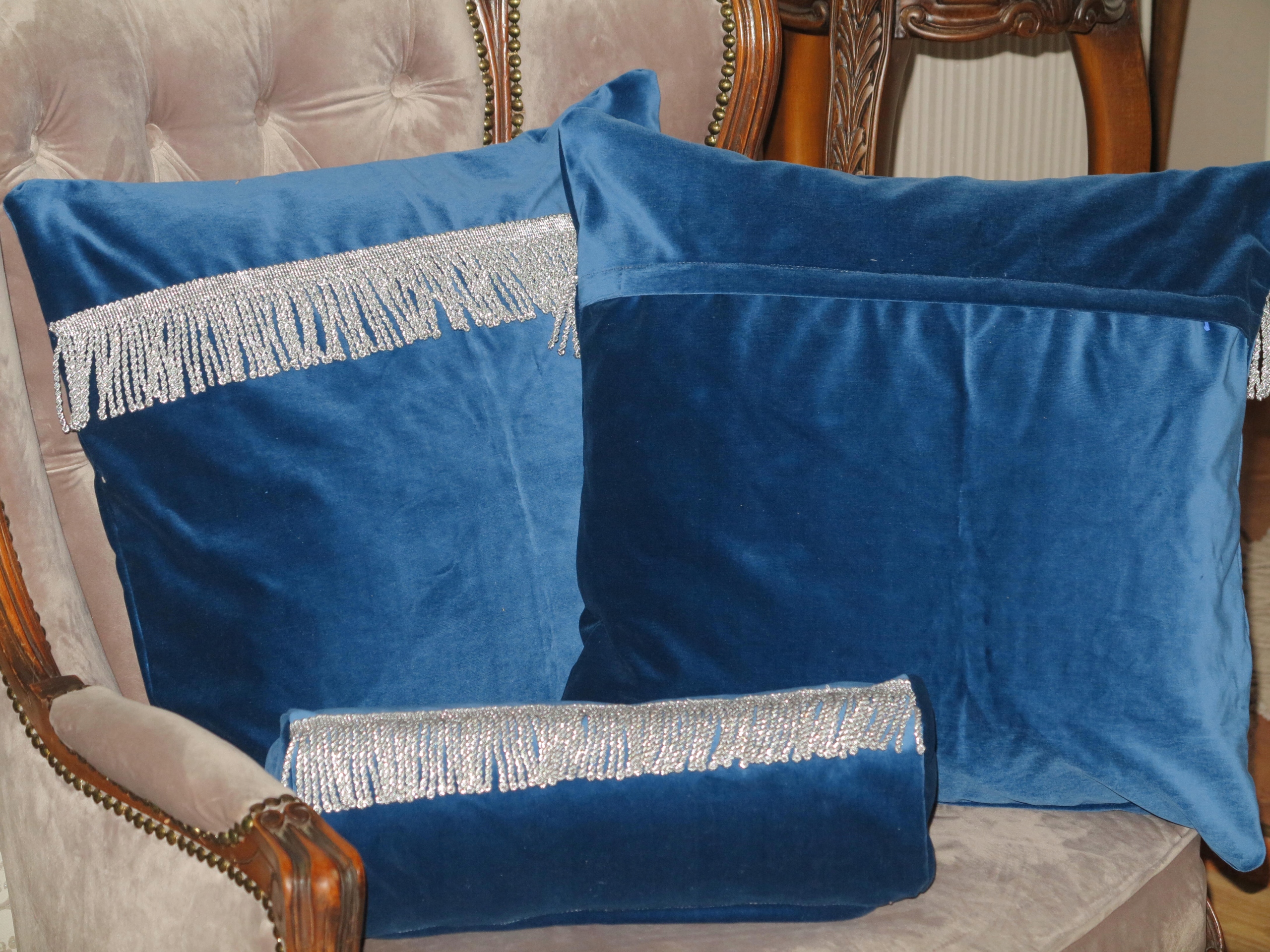 ДЛЯ АНТИКВАРИАТА - НЕВЕРОЯТНО КРАСИВЫЙ СТИЛЬНЫЙ БАРХАТНЫЙ КОМПЛЕКТ, СОСТОЯЩИЙ ИЗ ДВУХ БОЛЬШИХ НАВУШЕК И ДЕКОРАТИВНОГО ВАЛИКА, ПОЛНОСТЬЮ ИЗГОТОВЛЕННЫЙ ИЗ БЛАГОРОДНОЙ, ТОЛСТОЙ БАРХАТНЫЙ ХЛОПОК КРАСИВОГО ЦВЕТА ТЕМНО-СИНИЙ, С СЕРЕБРЯНОЙ РЕЗИНКОЙ И БАХАРКОЙ