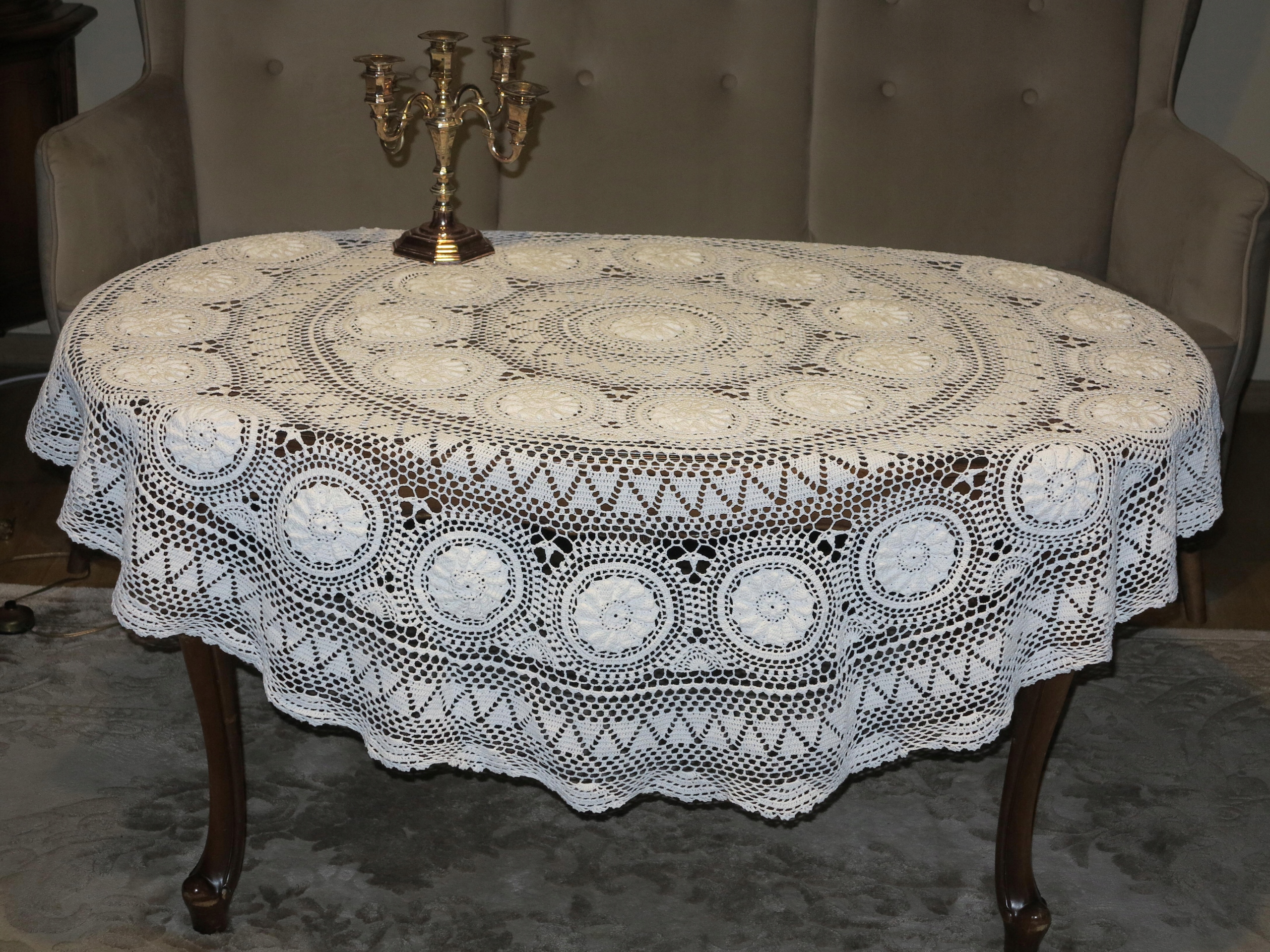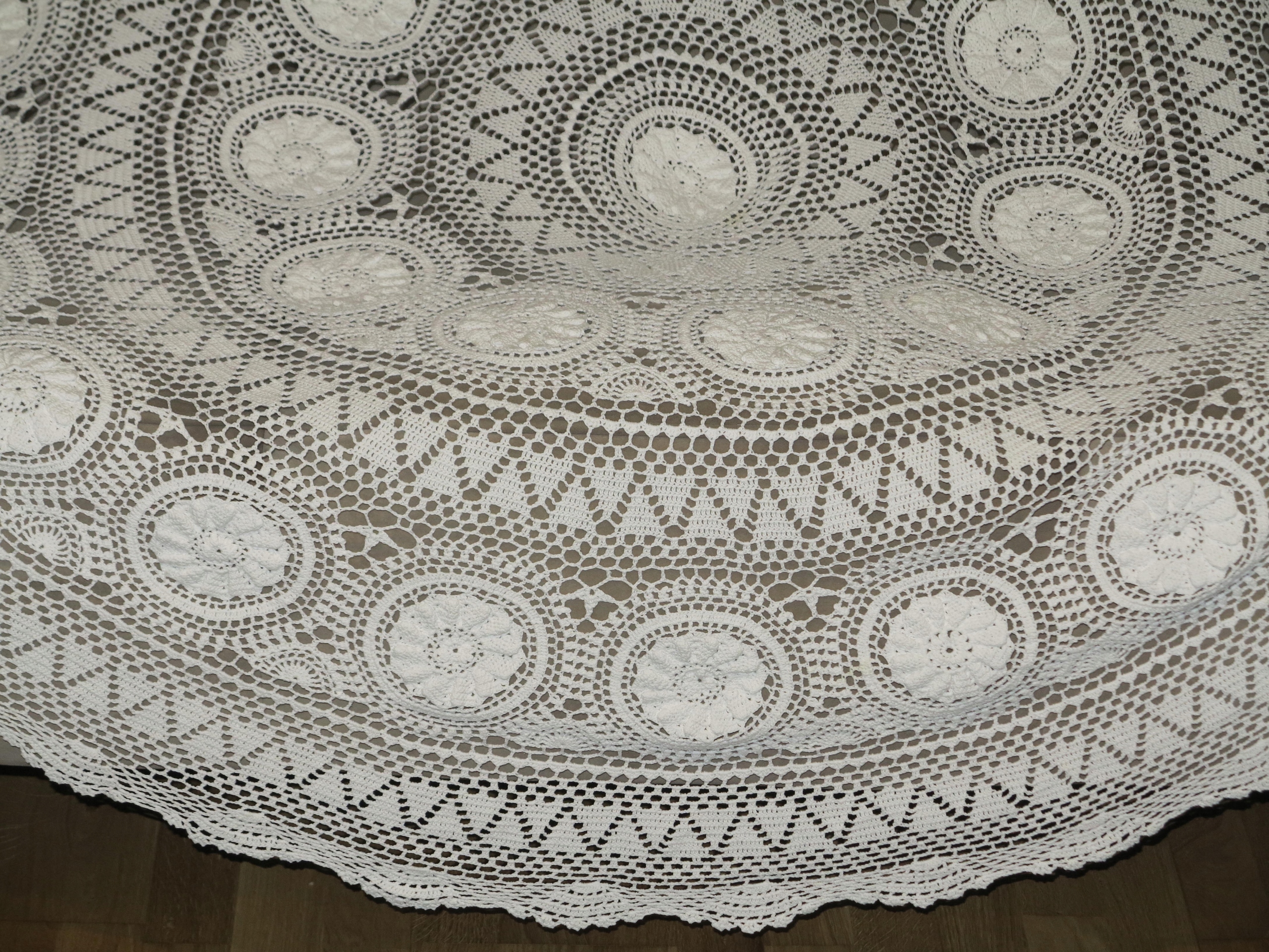 Тема аукциона - красивая скатерть, сделанная вручную в схеме вязания крючком. Это выглядит красиво на столе. Имеет размеры: диаметр: 150 см. Используется, в супер хорошем состоянии и качество. Я рекомендую.