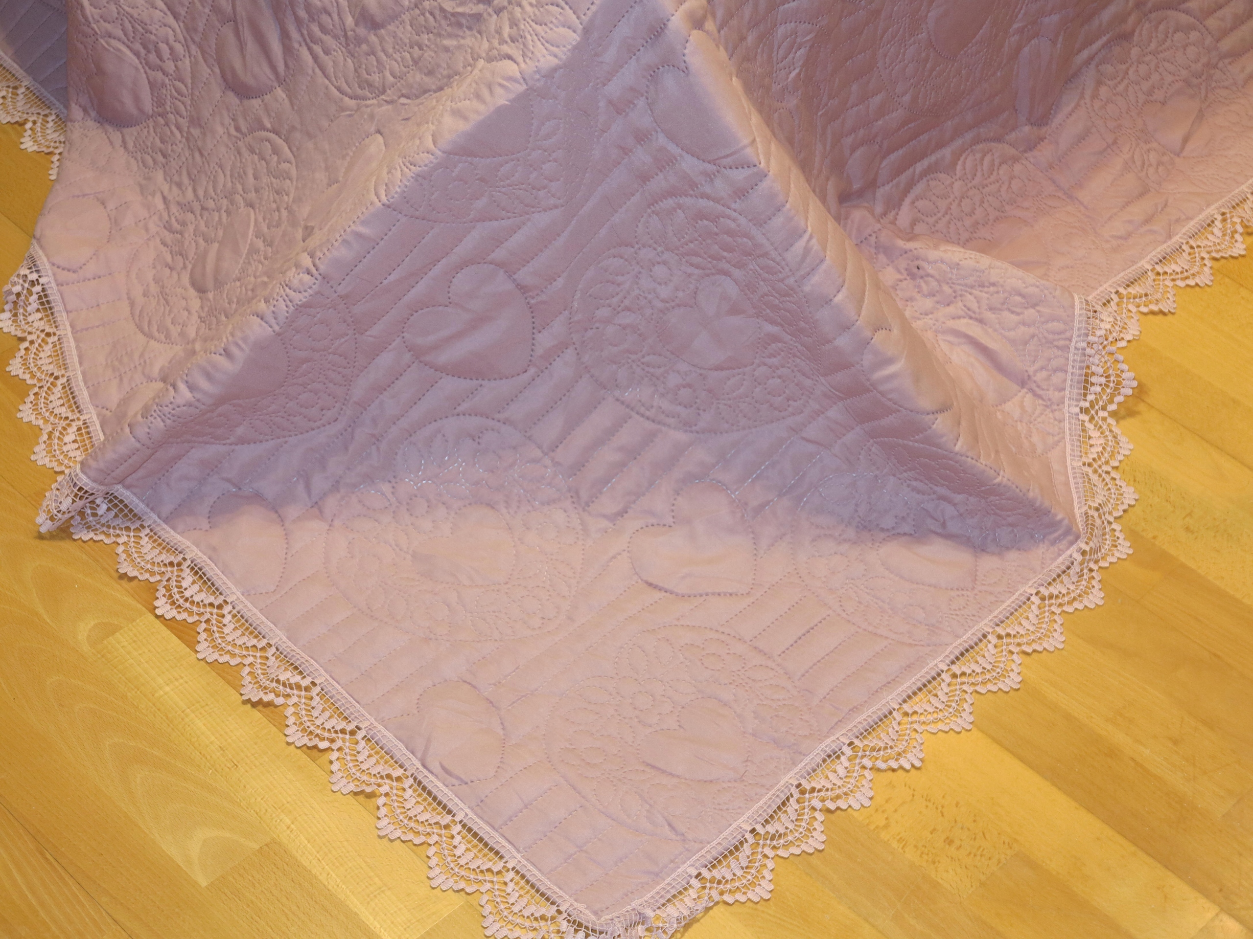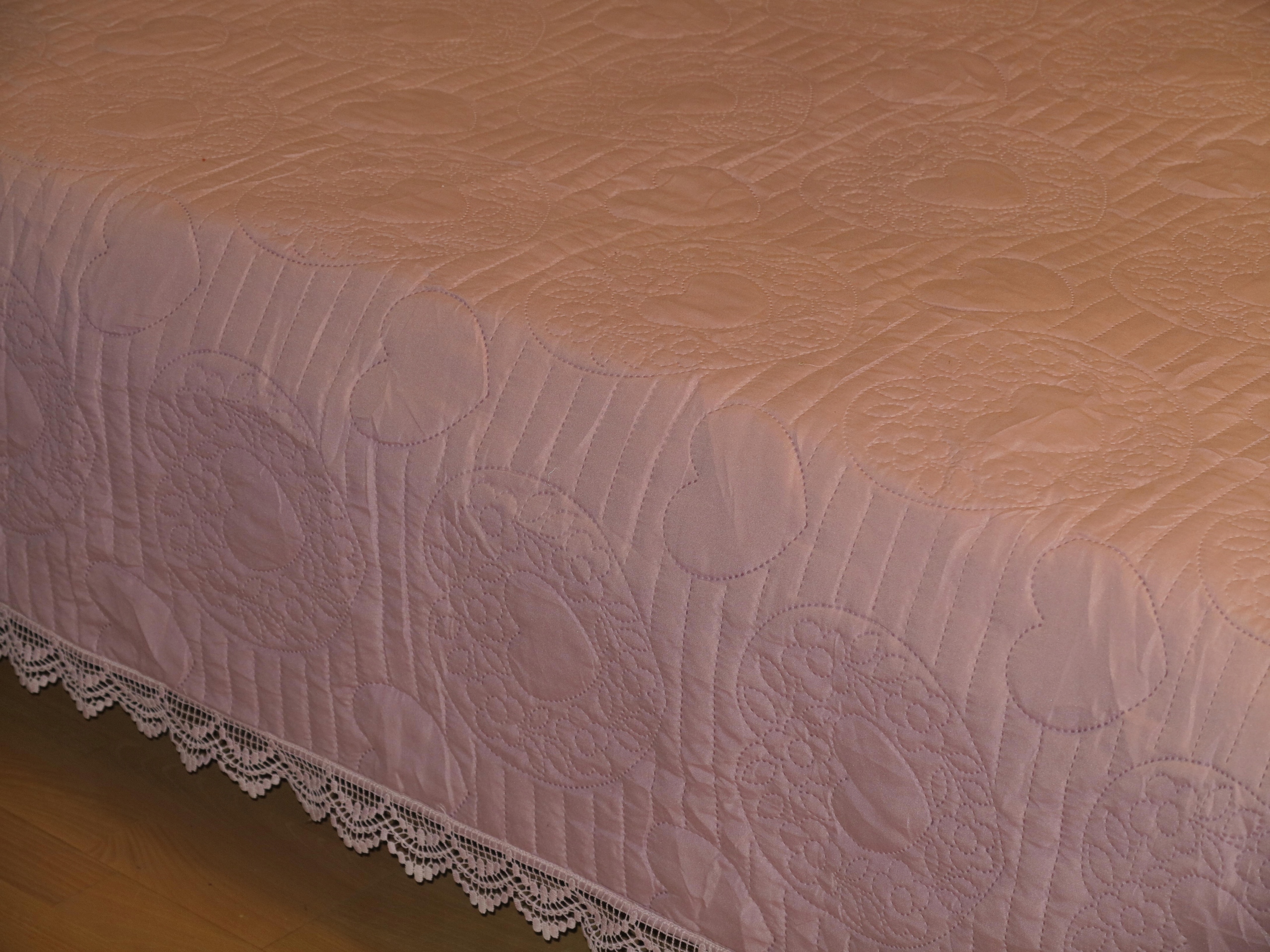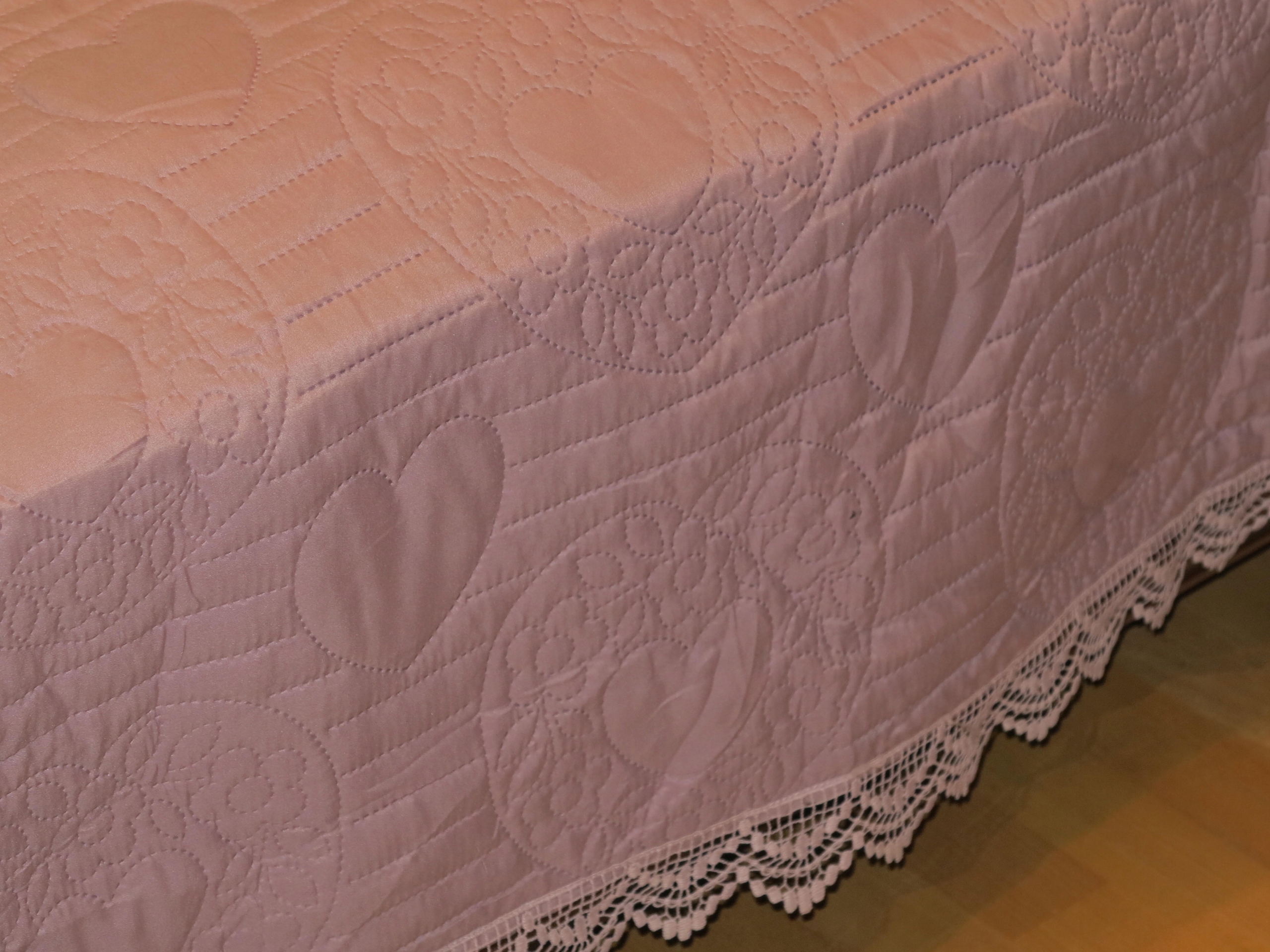 КРАСИВУЮ, ЛЕГКУЮ кроватку СО СТЕГАНЫМ УЗОРОМ СЕРДЦЕВ И СЕРДЦЕВ. ЦВЕТ: ТЕМНО-ПУДРОВЫЙ РОЗОВЫЙ/ЛИЛА (НИЖНЕЕ СВЕТЛЕЕ ПОРОШКОВЫЙ РОЗОВЫЙ). С ТРЕХ СТОРОН, ОТДЕЛЕННЫХ ГУИППИУРКОЙ