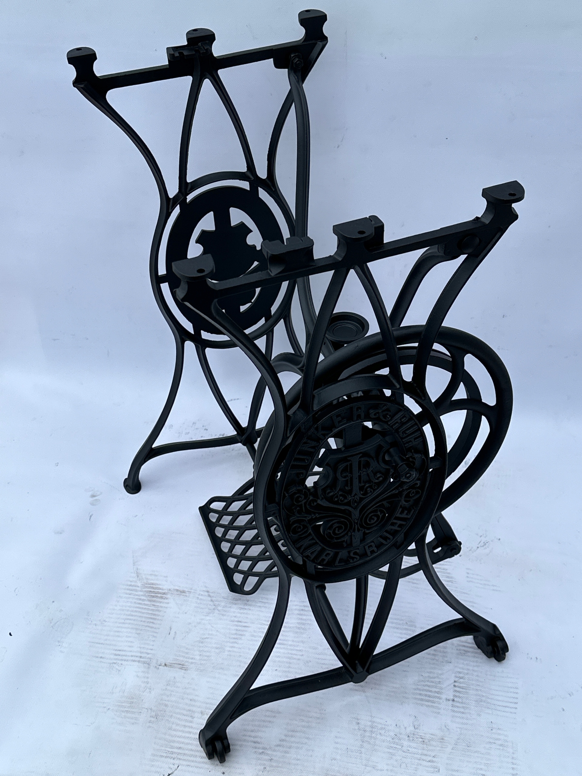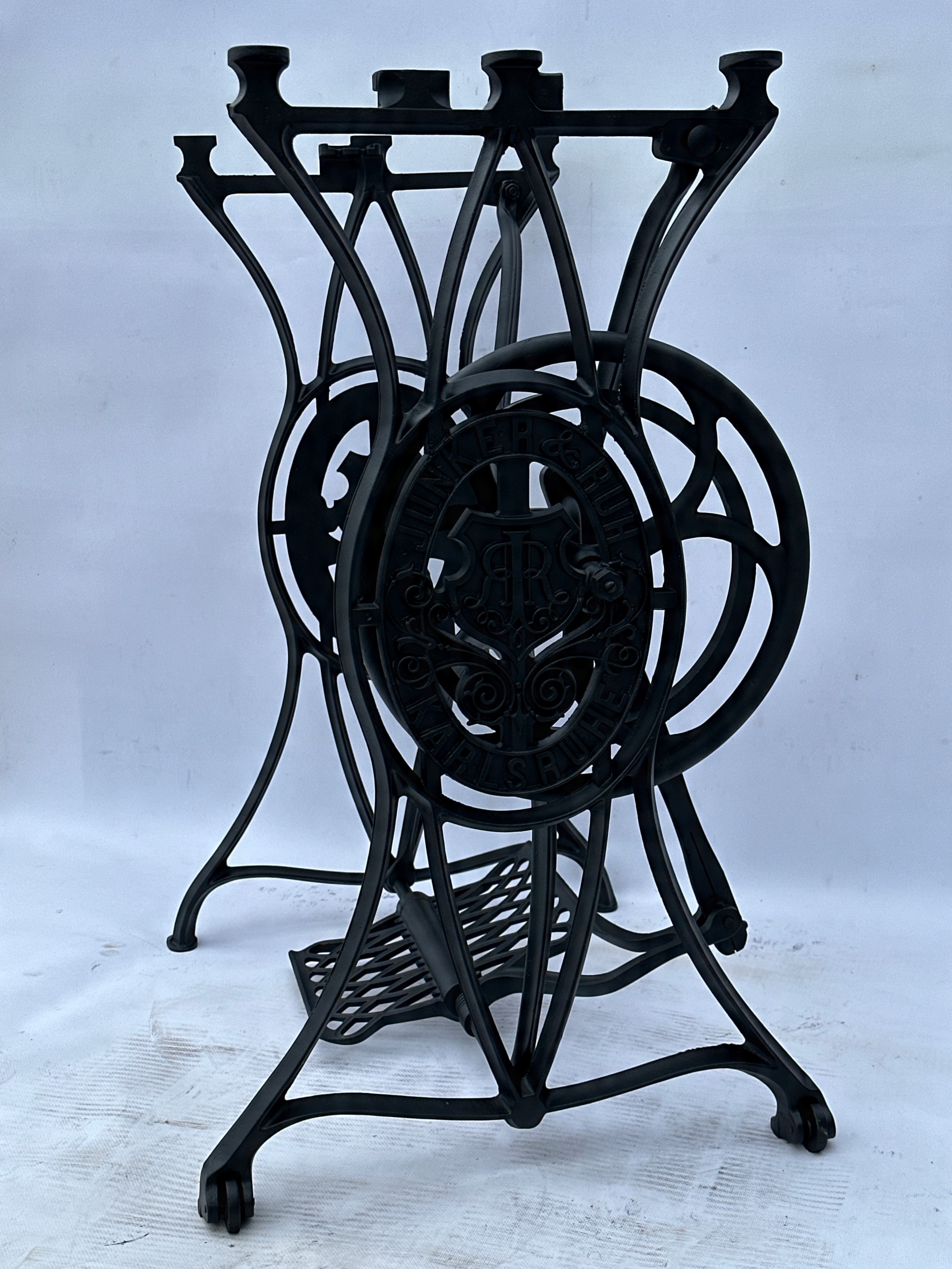 Предмет продажи — старая чугунная основа от швейной машины JUNKER & RUH. Очень красивый узор, встречается реже. Надписи JUNKER & RUH KARLSRUHE по бокам. Оба колеса находятся внизу.