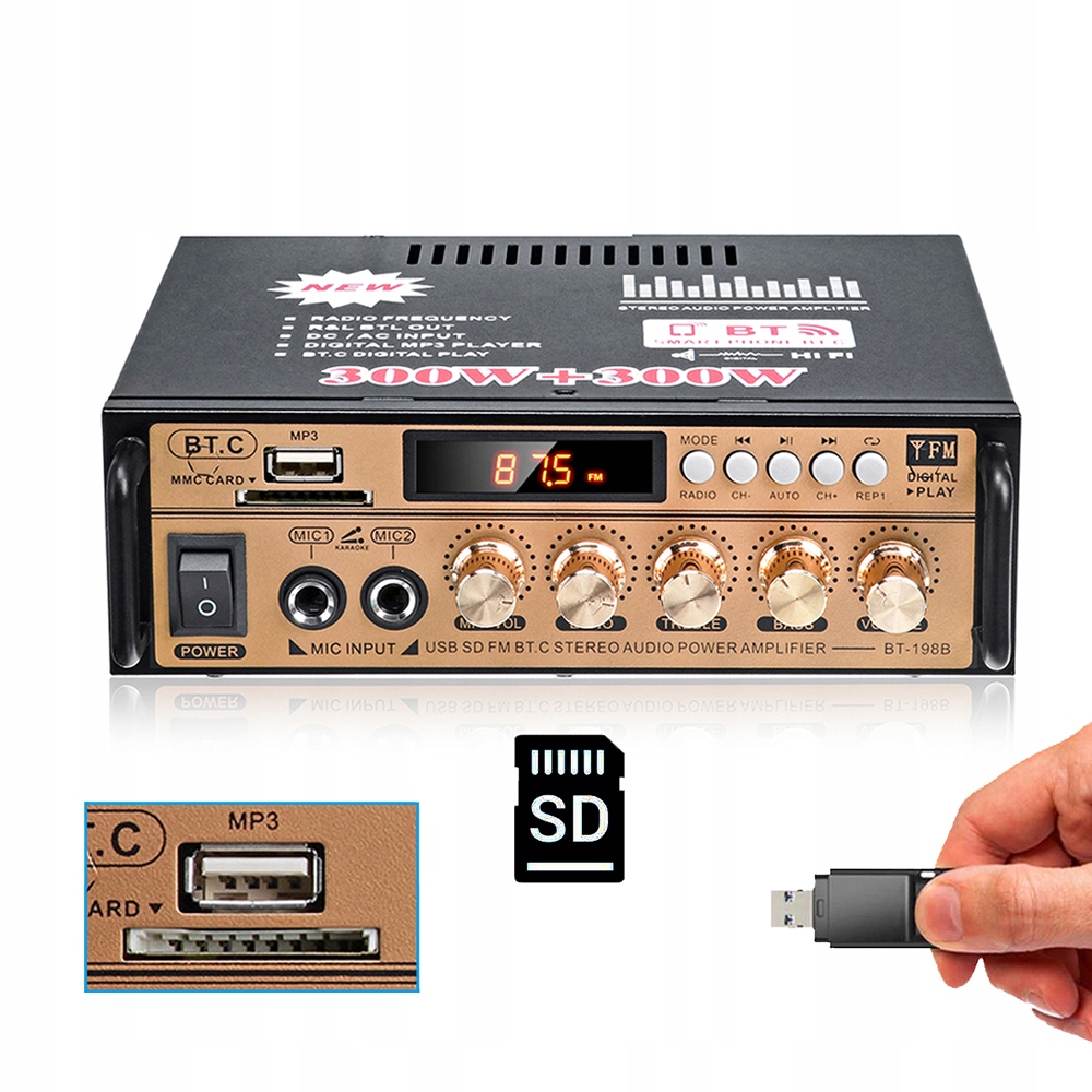 【Вход для карты USB/SD】 Этот усилитель имеет вход USB/SD, который позволяет воспроизводить файлы MP3 или подключаться к компьютеру. С его помощью вы сможете воспроизводить свою любимую музыку. Просто вставьте SD-карту или USB-накопитель для прямого воспроизведения музыки.