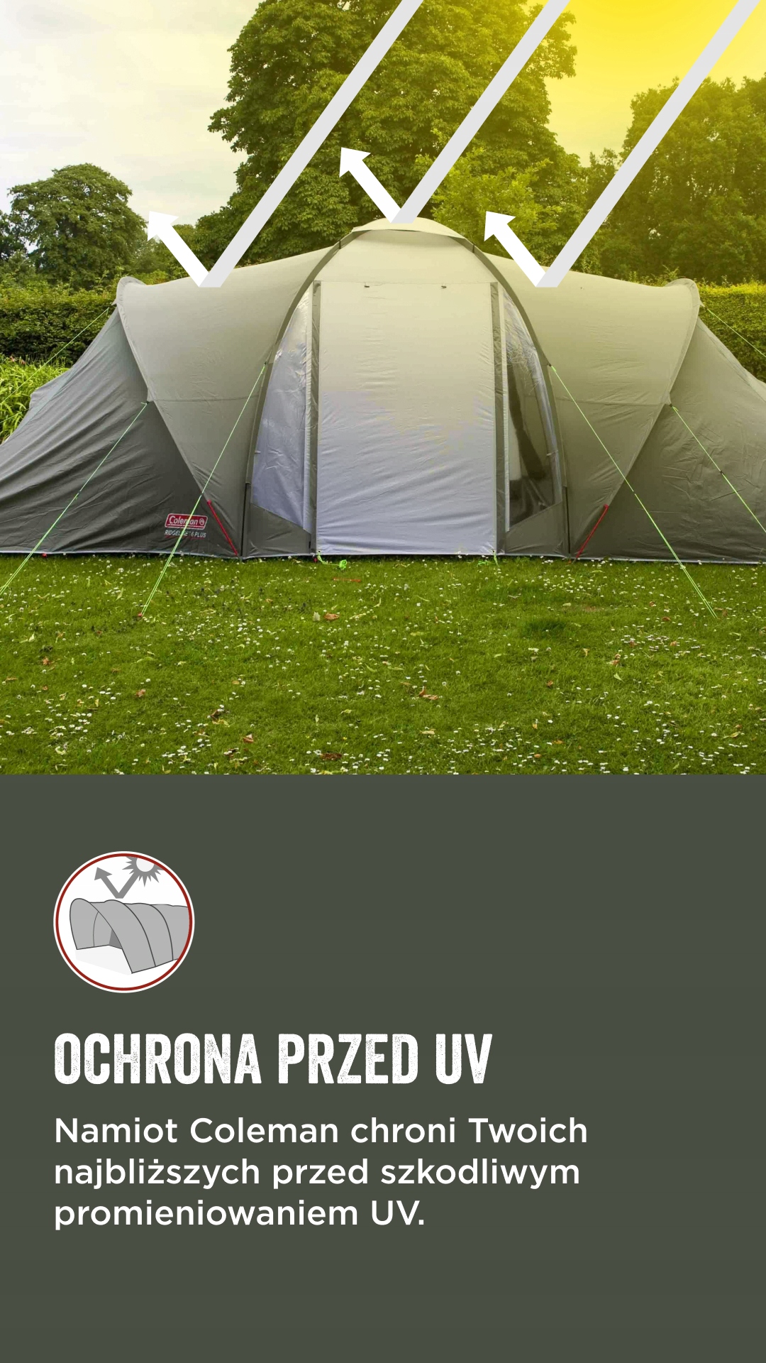 Просторная палатка в кемпинге с высоким залом, идеально подходящая для семьи из четырех человек. Преимущество палатки заключается в том, чтобы повесить вход в вестибюль, получить более крупную крытую поверхность. Два обширных входа гарантируют отличную внутреннюю вентиляцию. Две обширные спальни на противоположных сторонах палатки дают большую свободу и чувство уединения. В вестибюле прозрачные оконные панели осветляют интерьер, а съемный пол позволяет вам сохранять чистоту. Ультрафиолетовые охранники защищаются от ультрафиолетового излучения, пожарное покрытие защищает от неконтролируемого огня, а система простой настройки позволяет легко и быстро разбить палатку.