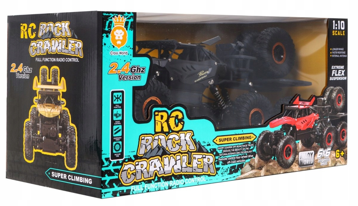 Внедорожник, выполненный на базе масштаб 1:10, с 6-колесным приводом, предназначен для детей от 6 лет. Автомобиль имеет большие резиновые шины и амортизаторы, он справляется даже с труднопроходимой местностью. В верхней части автомобиля имеются два запасных колеса. Конструкция автомобиля защищена от столкновений, устойчива к ударам и падениям, а также обеспечивает лучшие ходовые качества автомобиля. Игрушка управляется с помощью пульта дистанционного управления с помощью волн частотой 2,4 ГГц. Питание от аккумулятора 3,7 В 1200 мАч (в комплекте) - автомобильного и 2х ААА (не входят в комплект) - пульта дистанционного управления.