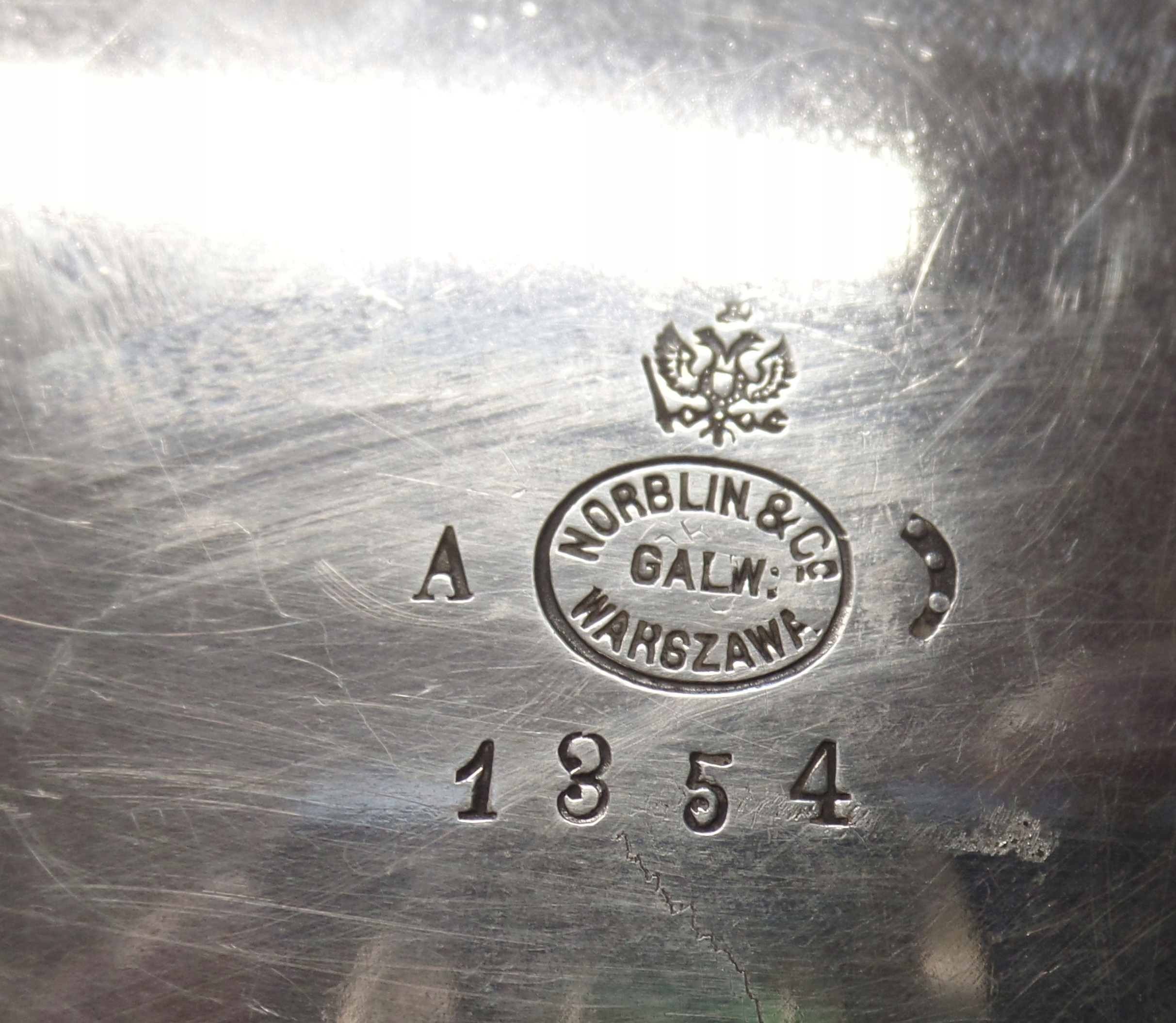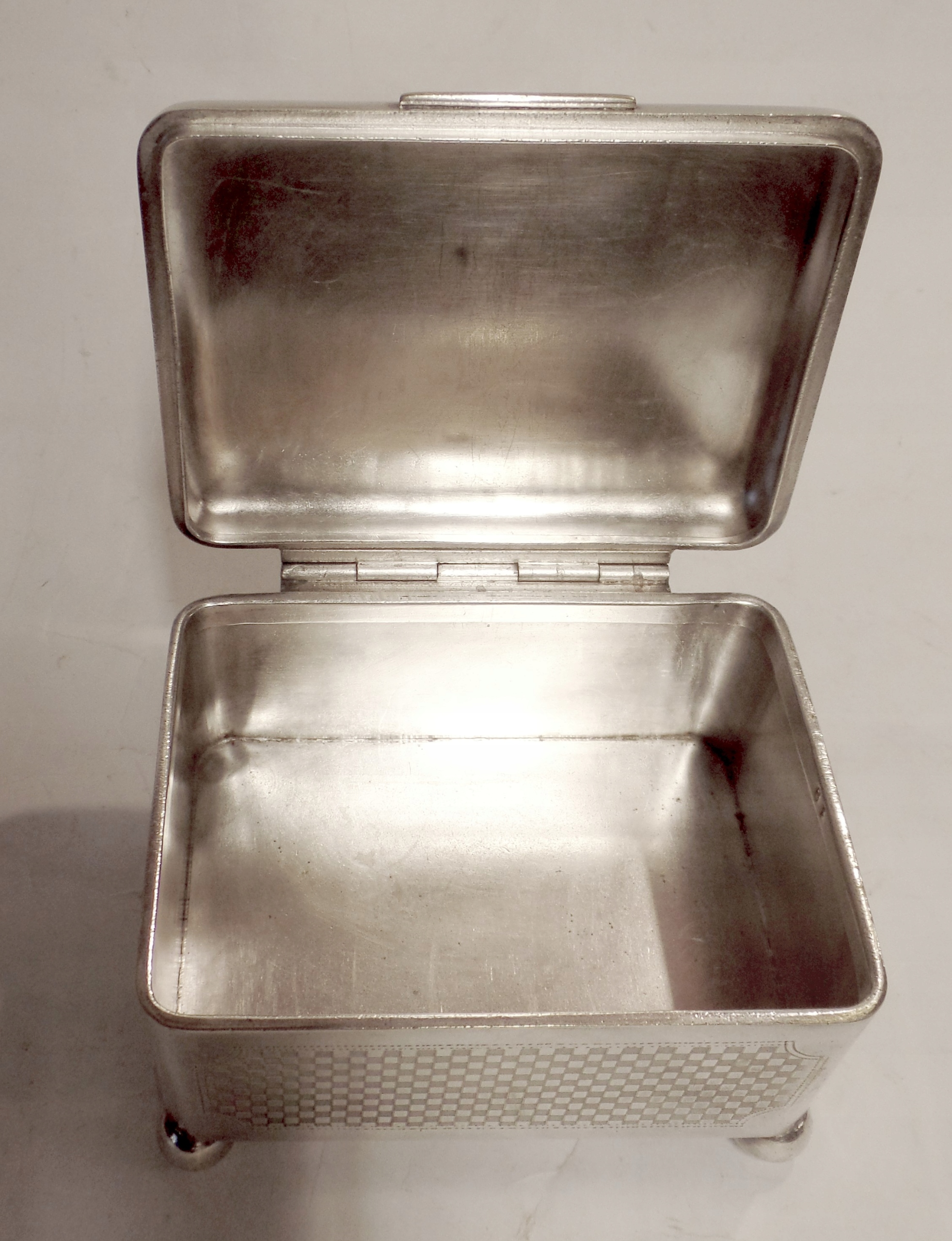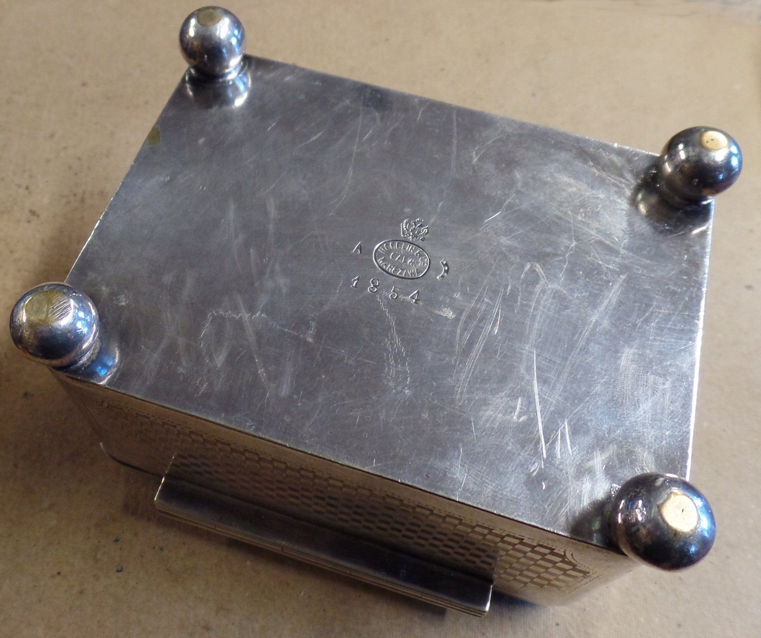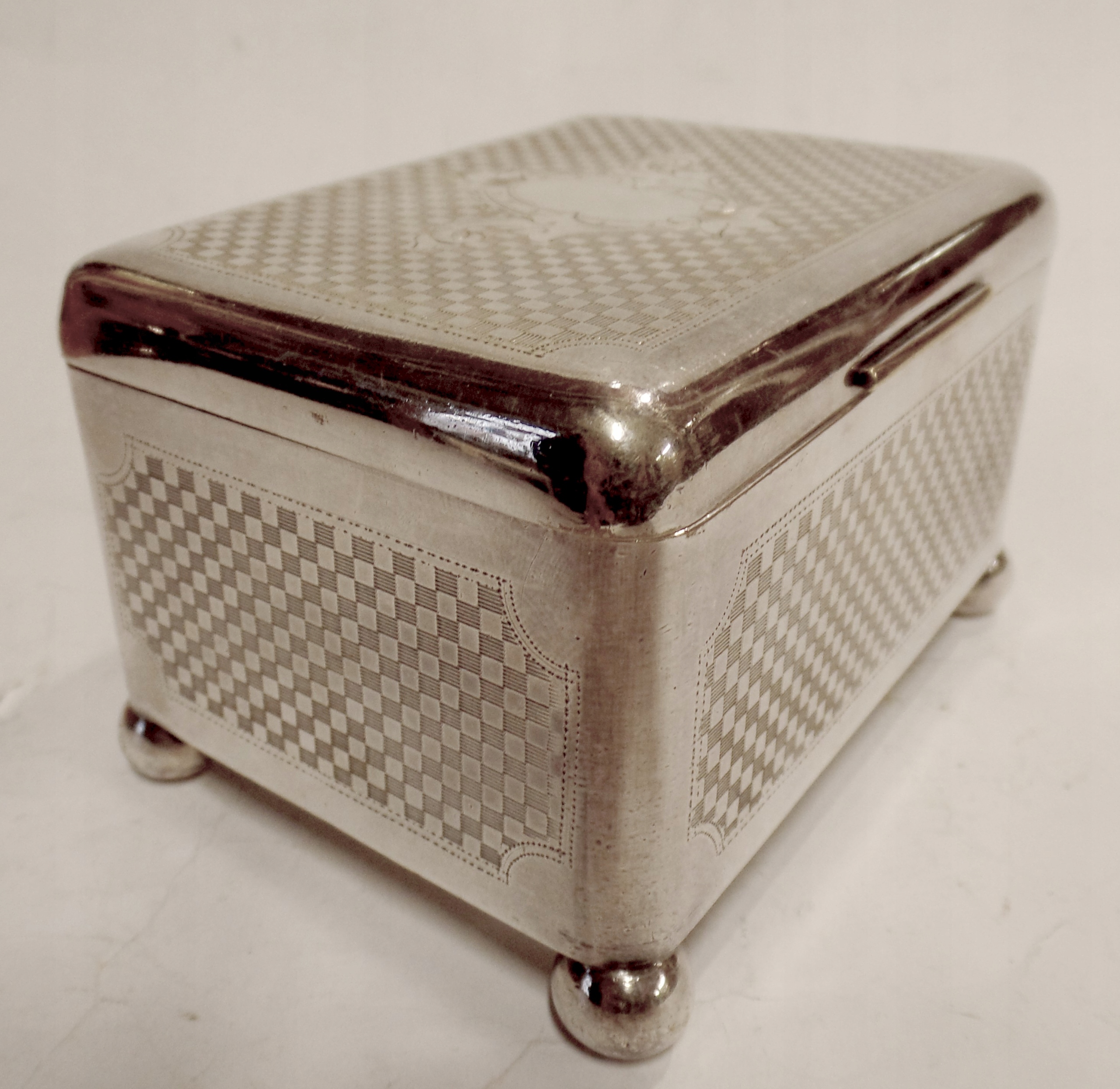 Ящик для сахара, прямоугольный корпус с закругленными углами, украшенный гильошированным решетчатым мотивом и гравированным картушем на крышке. Тело на четырех шарообразных ножках. Посеребренная латунь, размеры: высота 8 см, 9,5 х 12 см, легкая потертость. Внизу подписи производителя двуглавый орел / NORBLIN&Co / GALW: / WARSZAWA - в окружении / A / 1354 / и подковообразный знак. Варшава, 3-я четверть 19 века