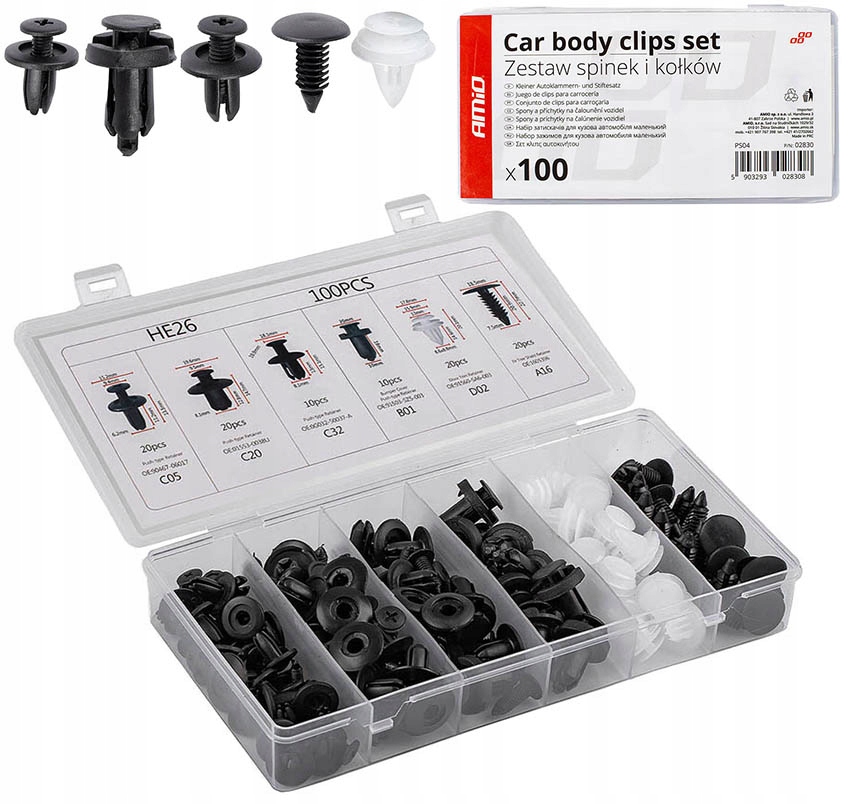 набор запонок и автомобильных колышков 100 шт. Набор включает в себя стандартные размеры, используемые в большинстве легковых автомобилей и фургонов.