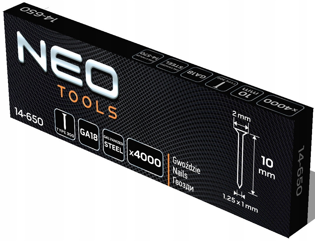 - Гвозди оцинкованные для пневматического степлера фирмы NEO, длиной 10 мм, GA18 тип 300 (F ) .