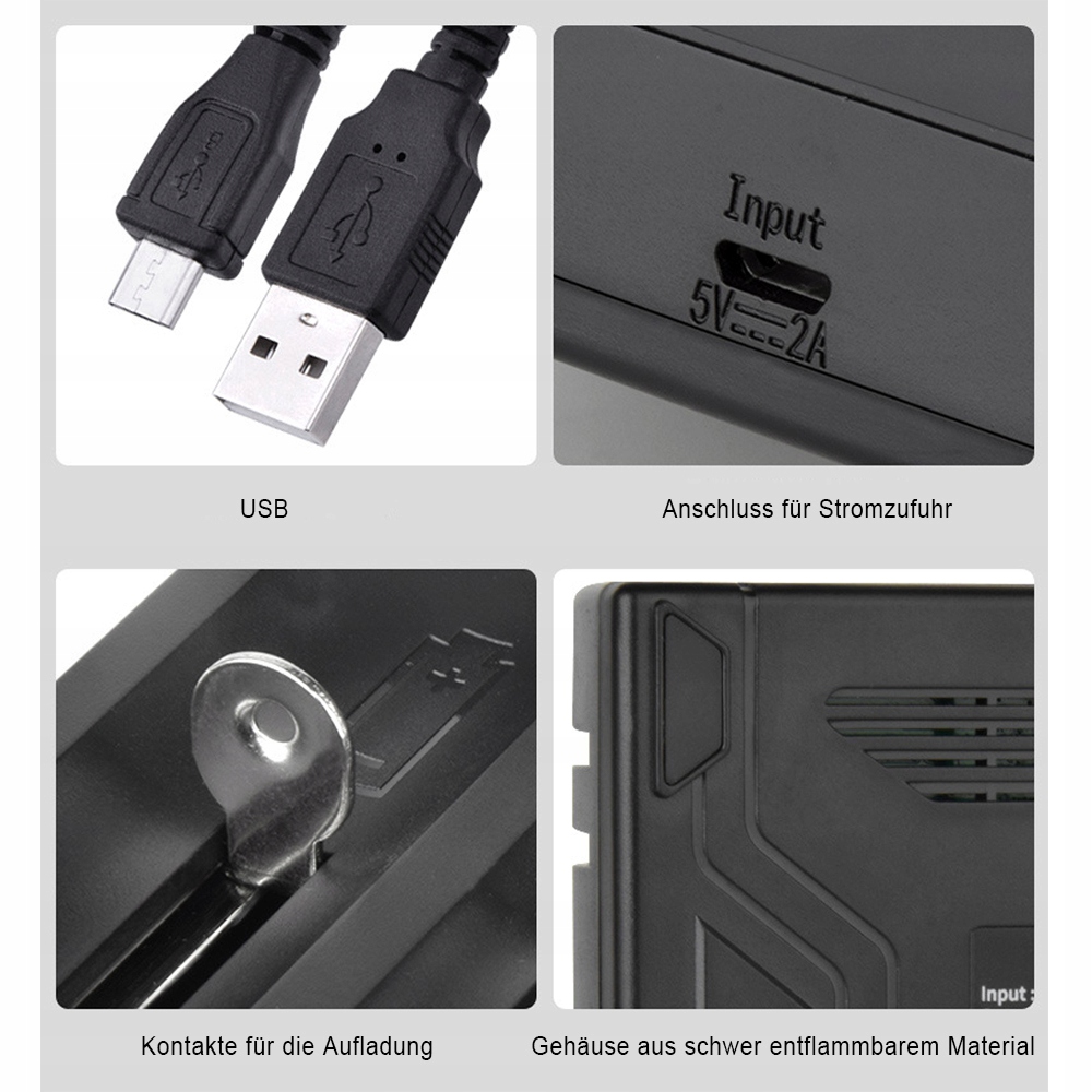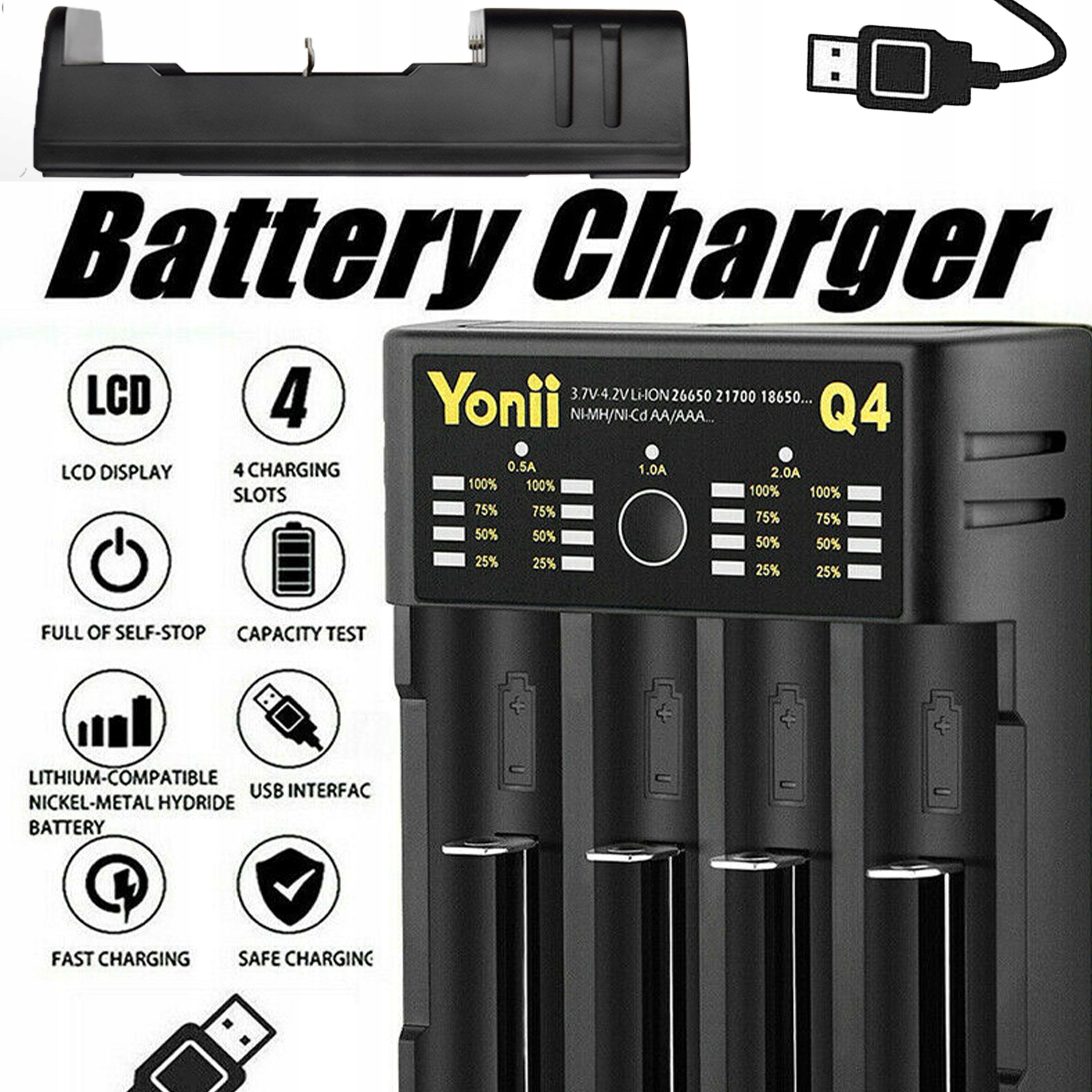 Fast Yonia D4 18650 Зарядное устройство с 5 В входной рельсы. 2 И с толстым USB -кабелем