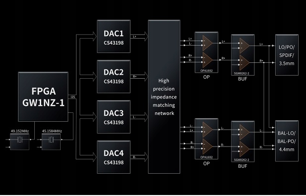 Линейные выходы 3,5 мм + 4,4 мм - Независимые схемы линейного армирования позволяют подключать активные динамики или внешние усилители. SPDIF -концентрический выходной сигнал низкого уровня сопоставим с выходом профессионального оборудования, а джиттер снижается на 70%, а высокая производительность обеспечивается при подключении к внешнему цифрово -аналоговому преобразователю с высоким классом. Цифро-аналоговый звук и немедленно получите функциональность потокового игрока.