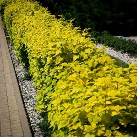 Листья сезонные, скрученные, овальные, 3-5-лопастные, длиной 5-10 см, интенсивно-желтые, в тени зеленовато-желтые. Осенью красно-желтая. Цветки белые, в зонтиковидных, полусферических соцветиях, шириной 5 см, июнь-июль.