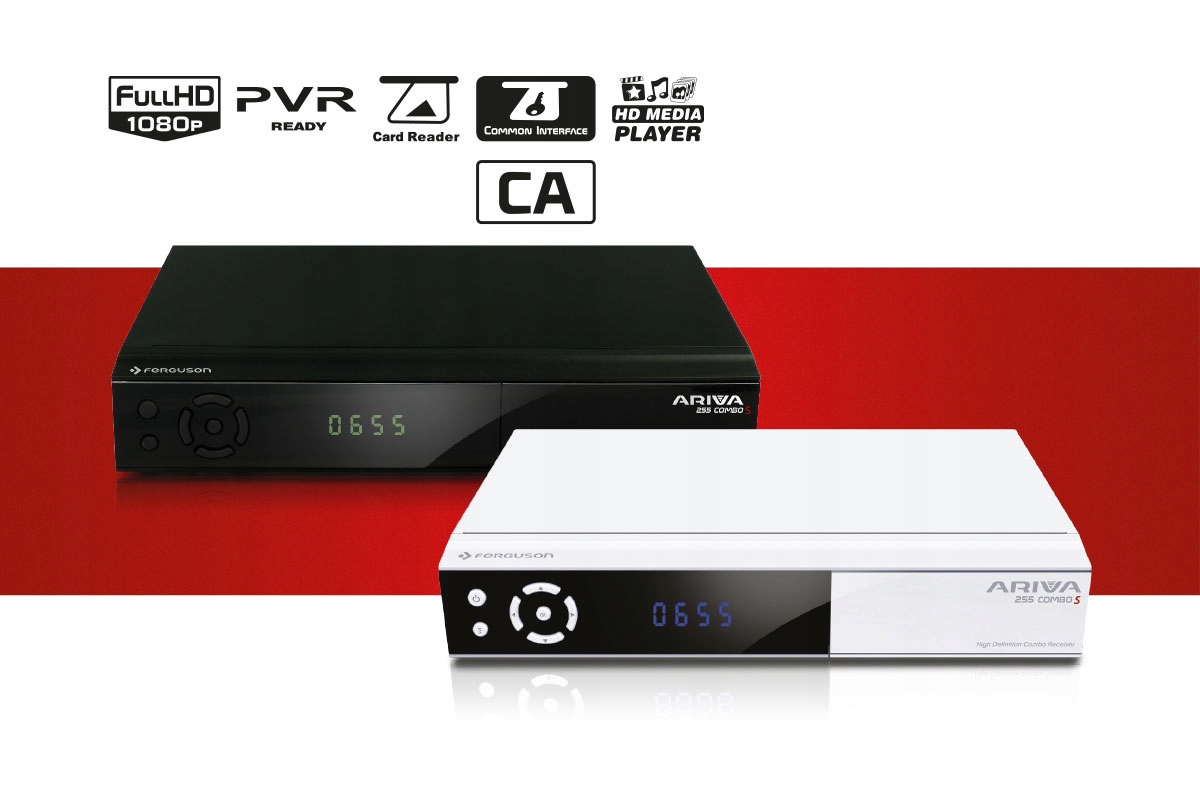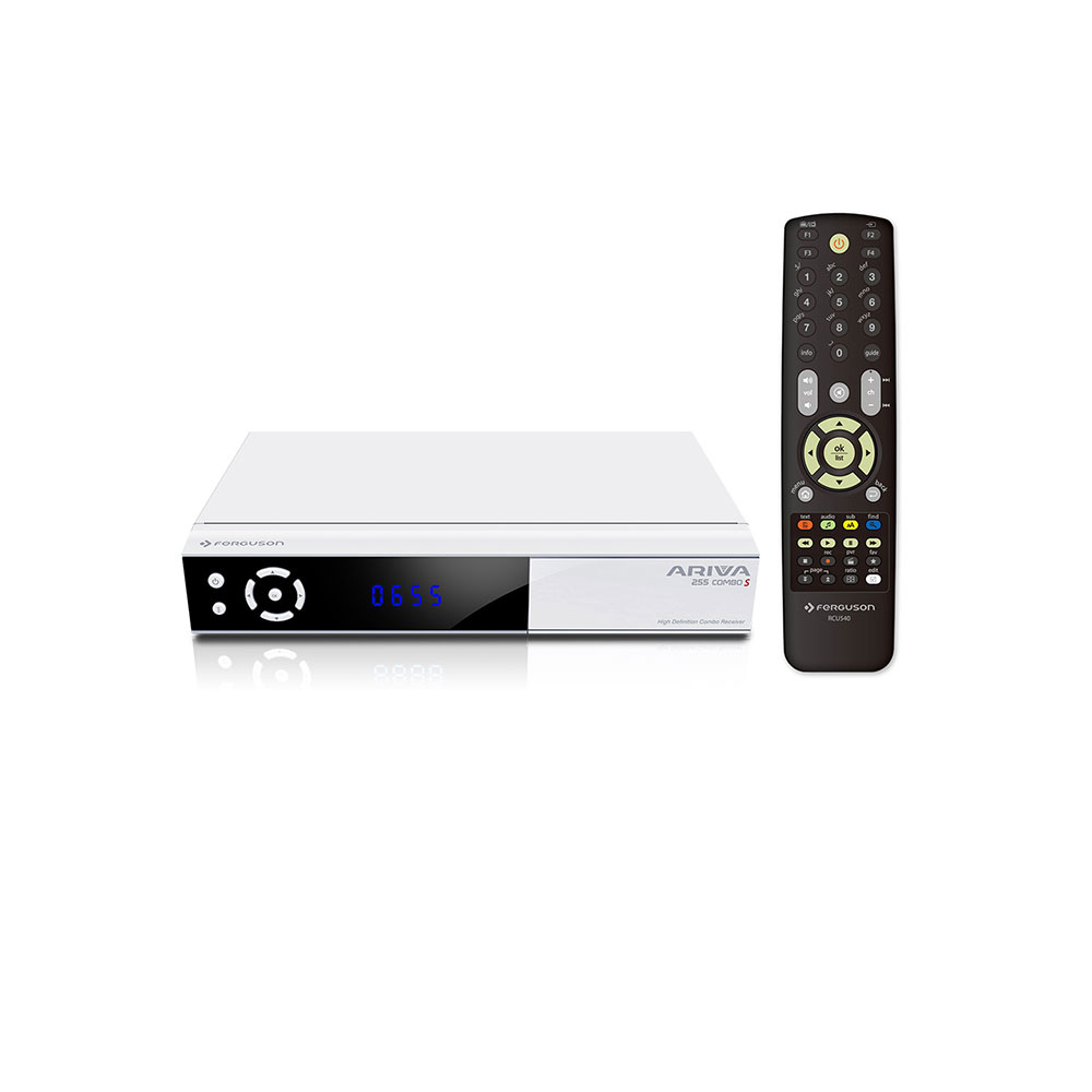 Тюнер спутникового ТВ Ferguson Ariva 255 Combo , то есть универсальный ресивер, обеспечивающий доступ как к спутниковому телевидению в стандарте DVB-S/S2, так и к кабельному телевидению в DVB-C. стандарт > или наземное цифровое телевидение, вещающее в стандарте DVB-T2 H.265 HEVC.