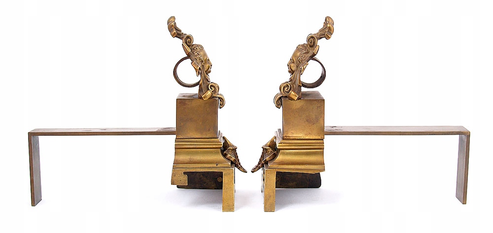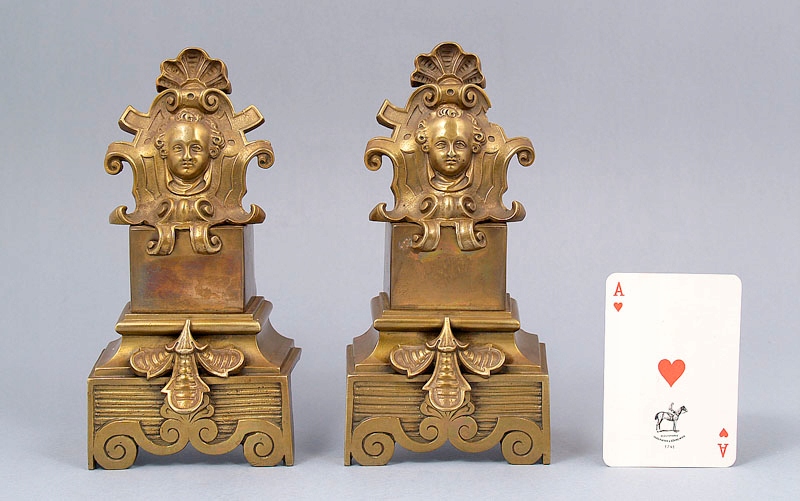 два декоративных элемента для камина с прикрепленными сзади плоскими планками в качестве опор для бревен. Фасад украшен литыми и резными элементами, изображающими голову ребенка на фоне античного орнамента, установленного на постаменте, внизу - трехлистный цветок.