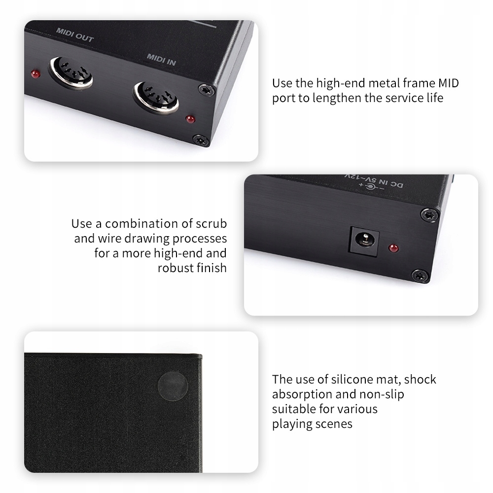 5. 【Прочная и высококлассная конструкция】: хост -коробка MIDI находится в металлической раме с высоким классом с матовой и матовой отделкой, обеспечивая долговечность и смысл премиум -класса. Он также имеет силиконовые поглощающие колодки и сопротивление скольжению, что делает их подходящими для различных сценариев производительности. Он совместим с источниками твердого звука, MIDI -эффекторами, контроллером MIDI -настройки, гитарными эффекторами, MIDI -клавиатурами, прокладками -барабанами MIDI и другими устройствами.