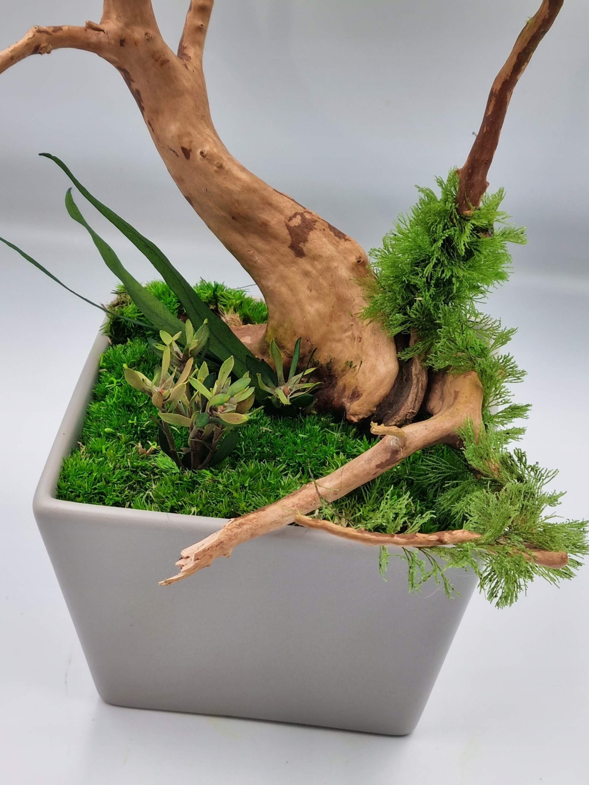 Деревья полностью изготовлены из 100% природных растений, то есть мх, тропических растений, азиатских корней. растения стабилизированы, что означает, что им не нужны особые условия для жизни.