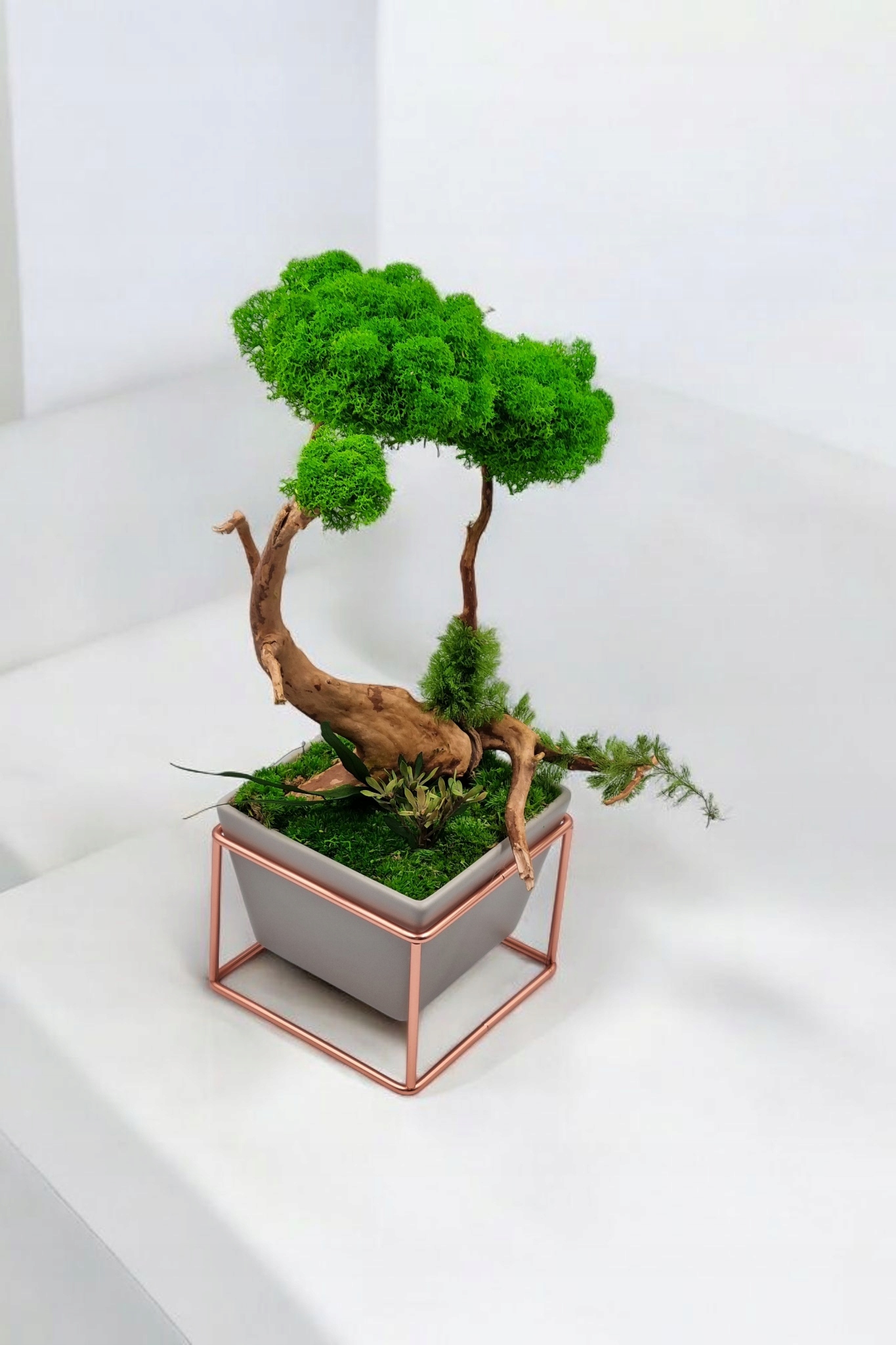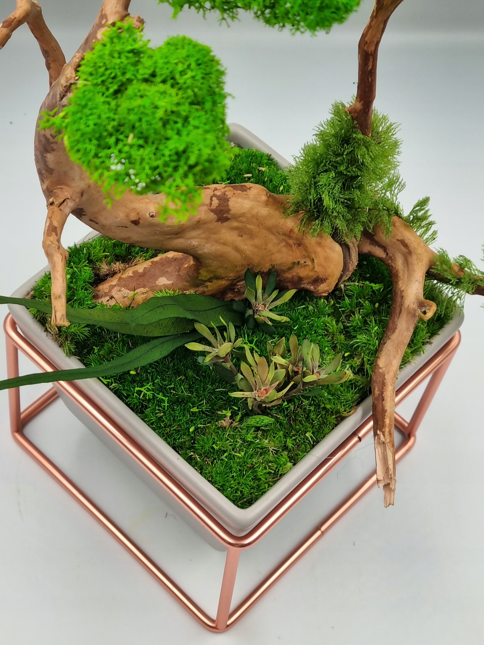 Моссное дерево представляет собой композицию с зеленым чушью с добавлением подушки моха и стабилизированными растениями с красивым экзотическим азиатским корнем. Сделано дерево в бетонном горшке в стиле чердака с розовой золотой базой