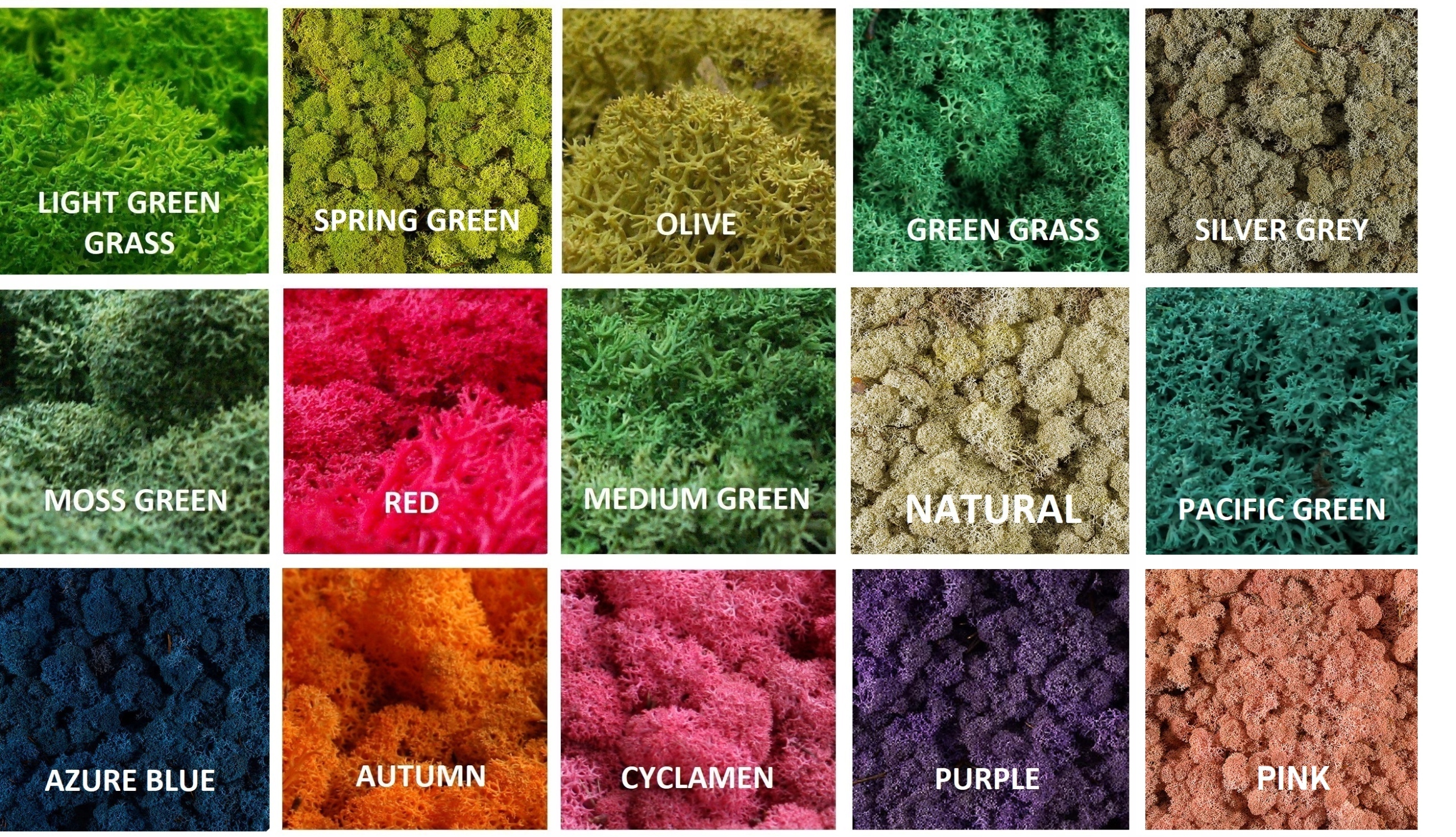 На выбор доступно 15 цветов мха, представленных на фото ниже.