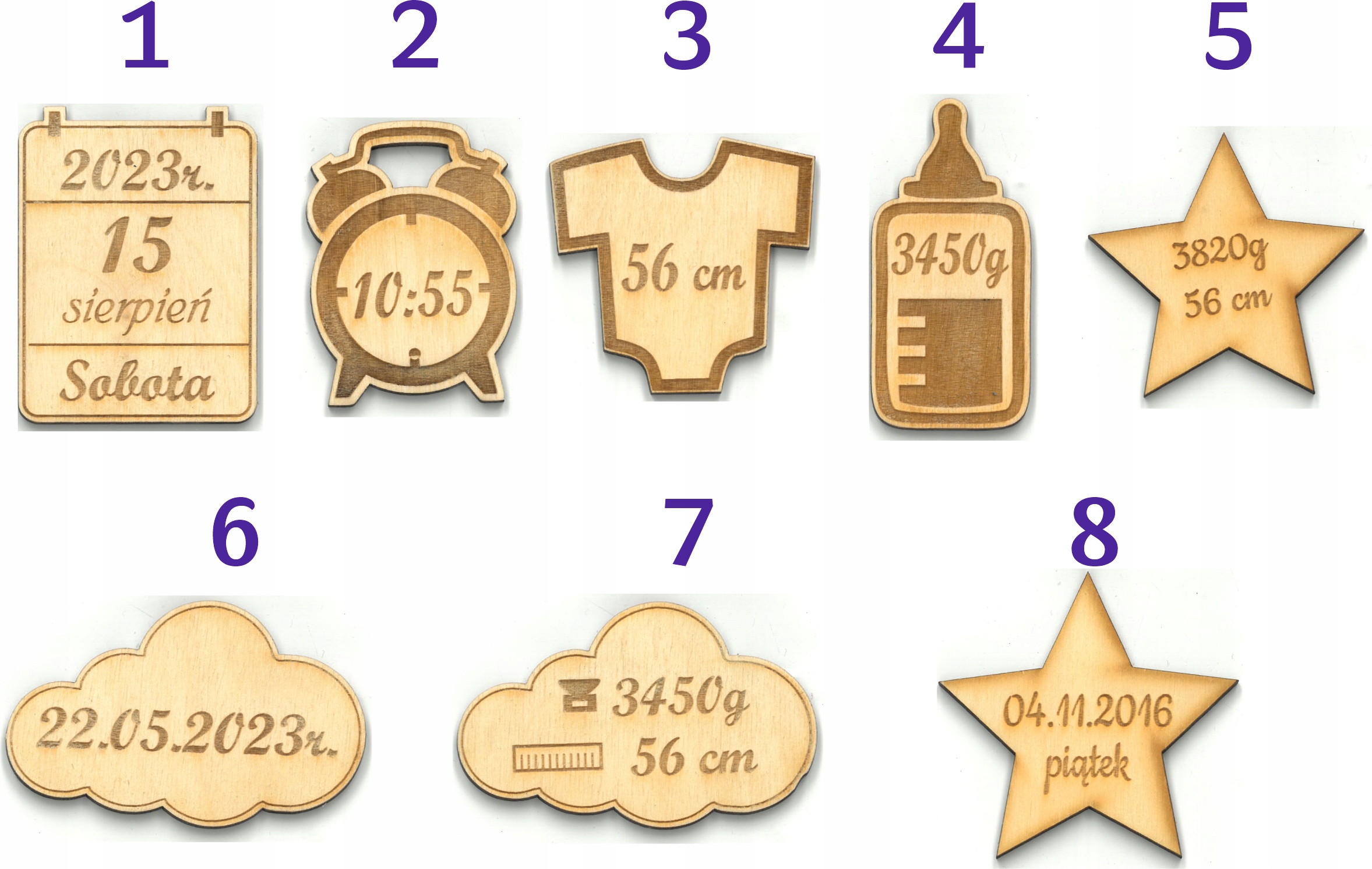 Деревянная эмблема с гравированной датой, временем рождения, весом и ростом ребенка.