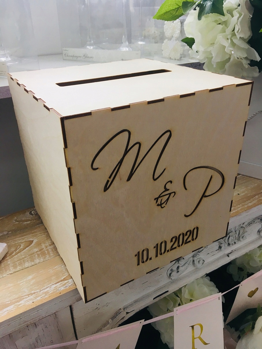 Коробка с вашими инициалами и датой! В сообщении нам напишите инициалы, например ваше имя, и дату свадьбы, которую мы должны создать для вас на одной из стенок ложи.