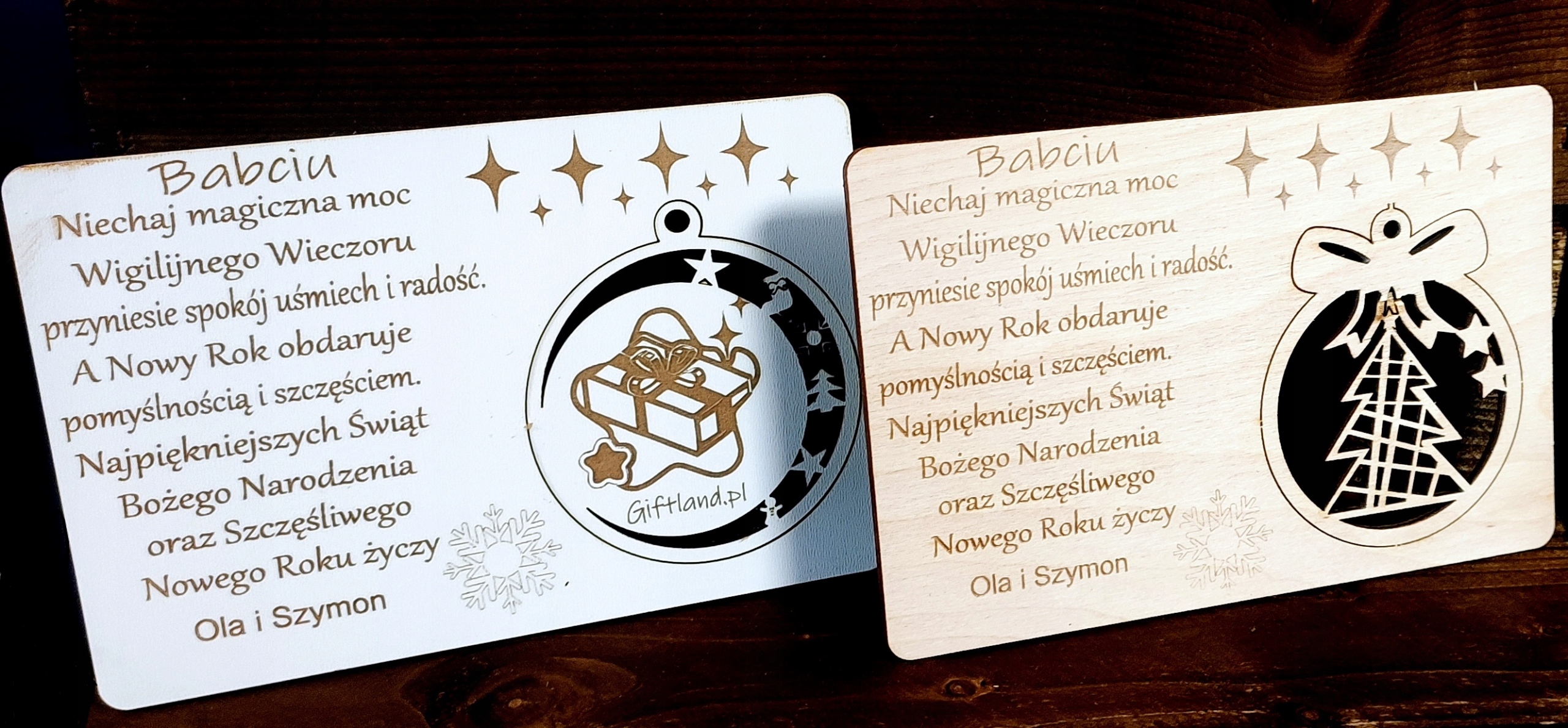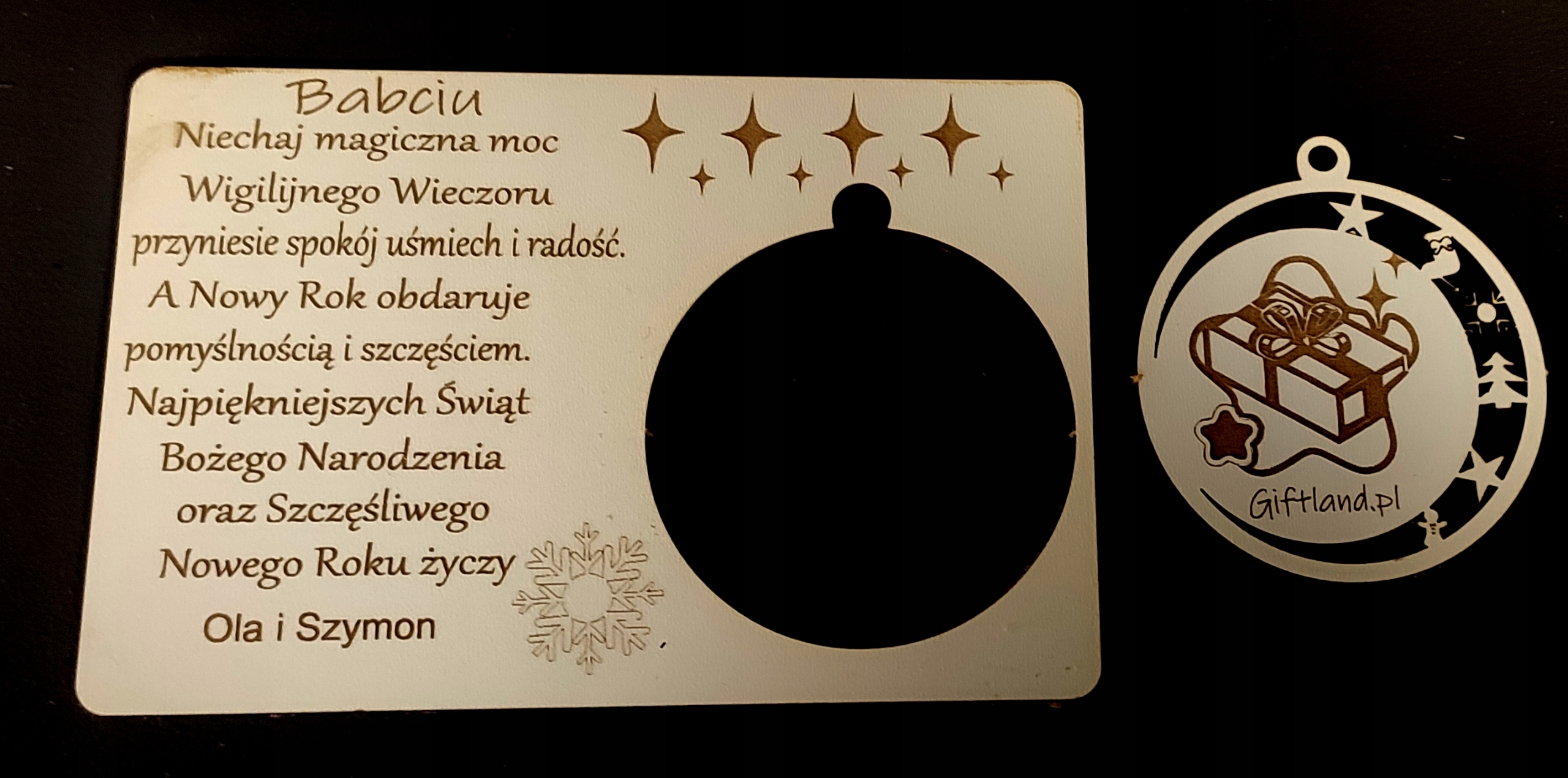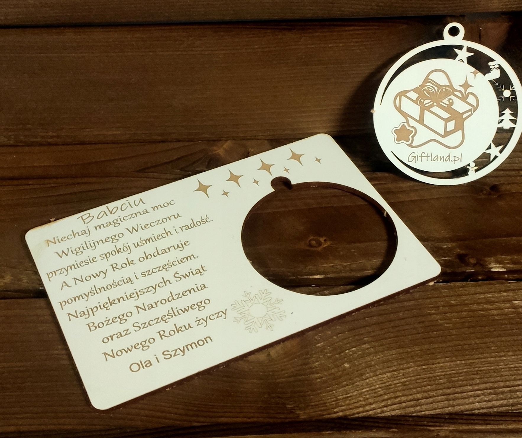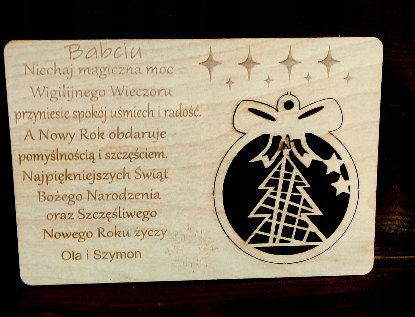 Дерев'яна різдвяна листівка з персональним екологічним логотипом і знімною кулькою