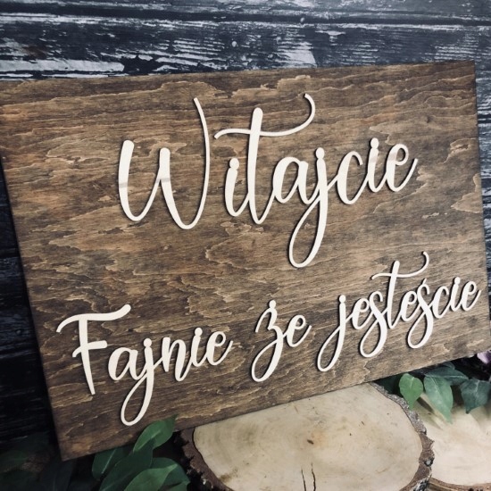 Деревянная свадебная доска цвета темного дерева, изготовлена из фанеры, пропитана маслом. Кроме того, на нем имеется надпись «Привет, приятно видеть вас здесь» натурального деревянного цвета.