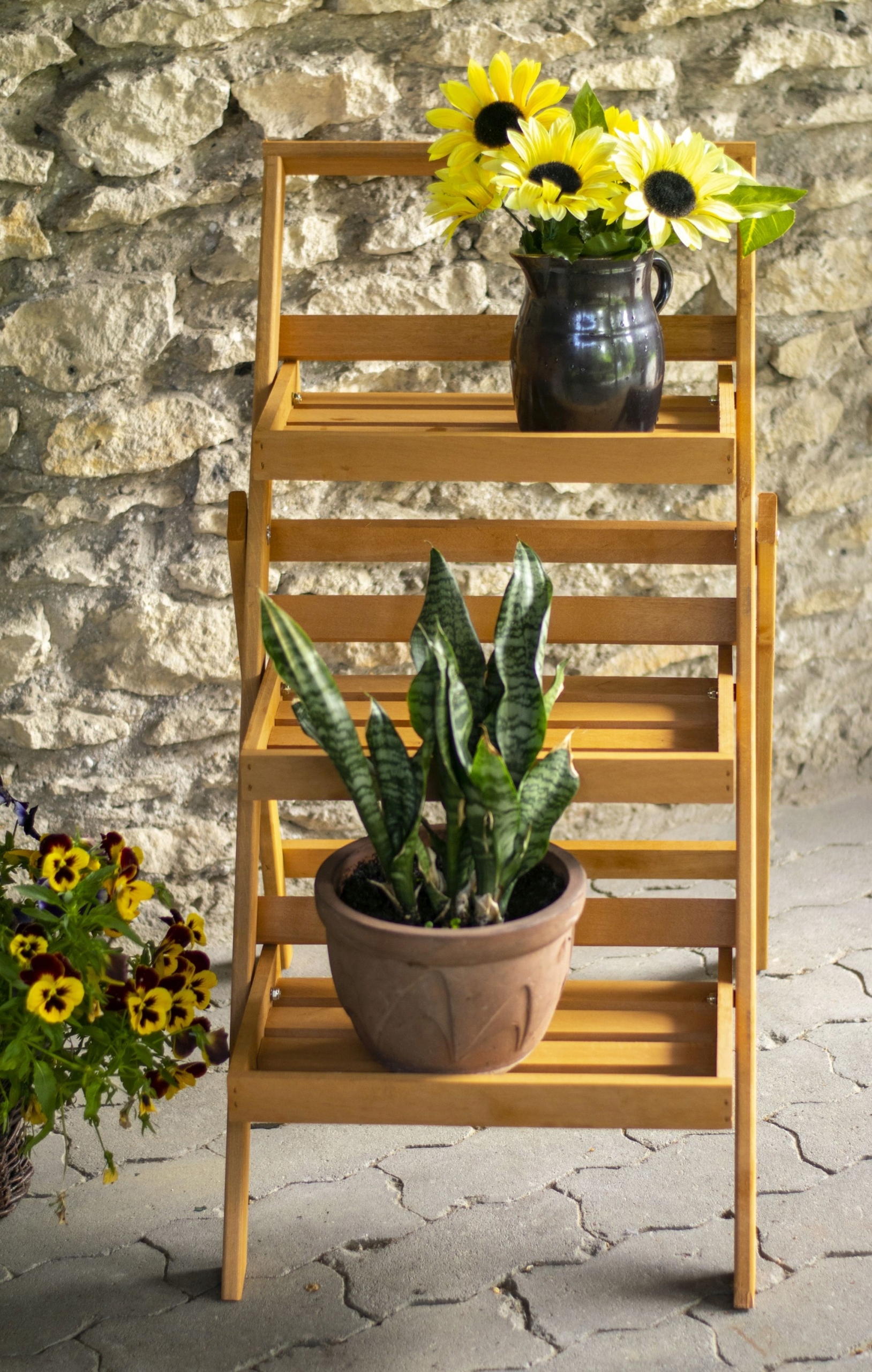 Деревянная складная цветочная площадка, стоящая на книжном шкале для лестницы цветов