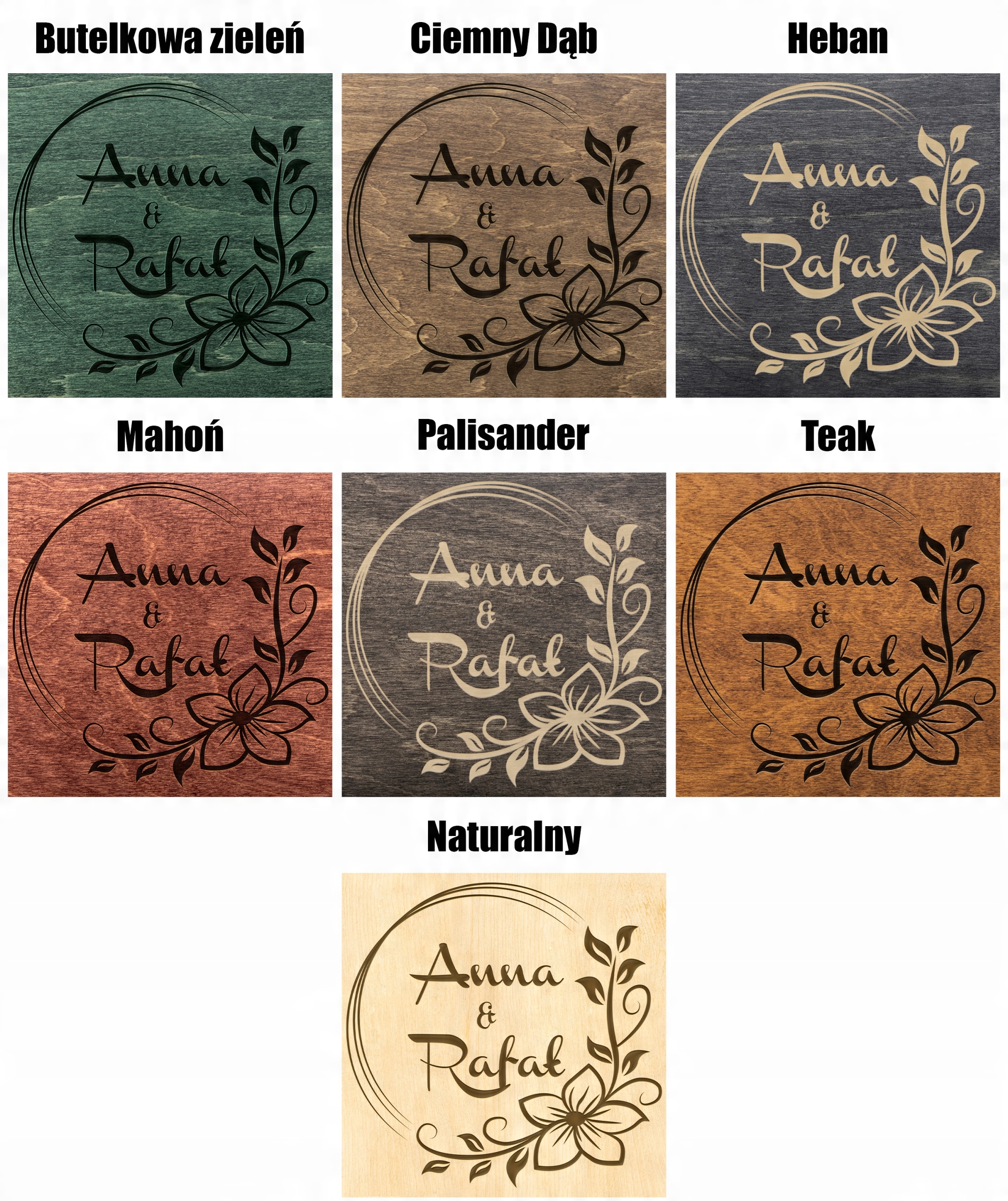 (Выбранный цвет одновременно применяется к древесине и гравировке - в соответствии со следующими фотографиями)