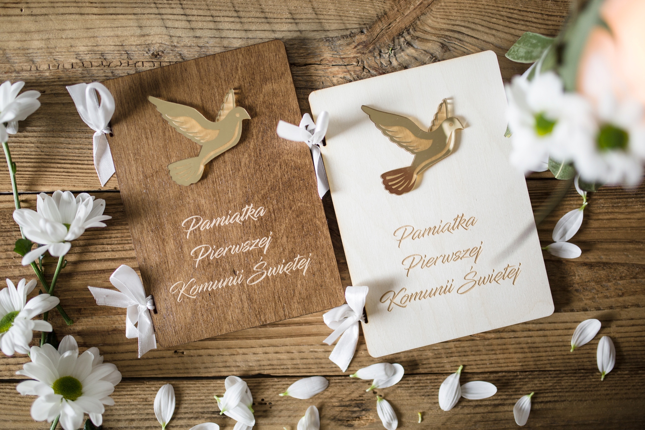 Альбом мини -причастия с деревянной обложкой и гравировкой, к которой вспышка добавляется зеркальным мотивом золотого капустного рулона.