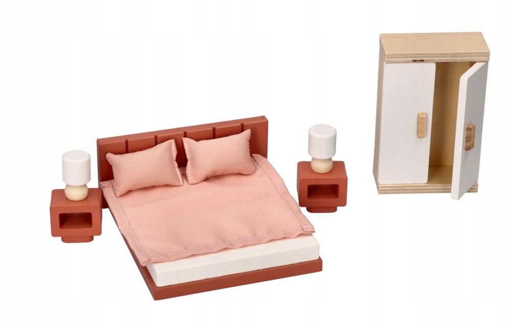 Уютная деревянная спальня - идеальное место для отдыха после дня, полного веселья. Набор был разработан для кукольного домика и содержит все необходимые элементы для создания капризного, удобного интерьера: удобная кровать с постельными принадлежностями, прикроватная стола, лампа и гардероб для одежды.