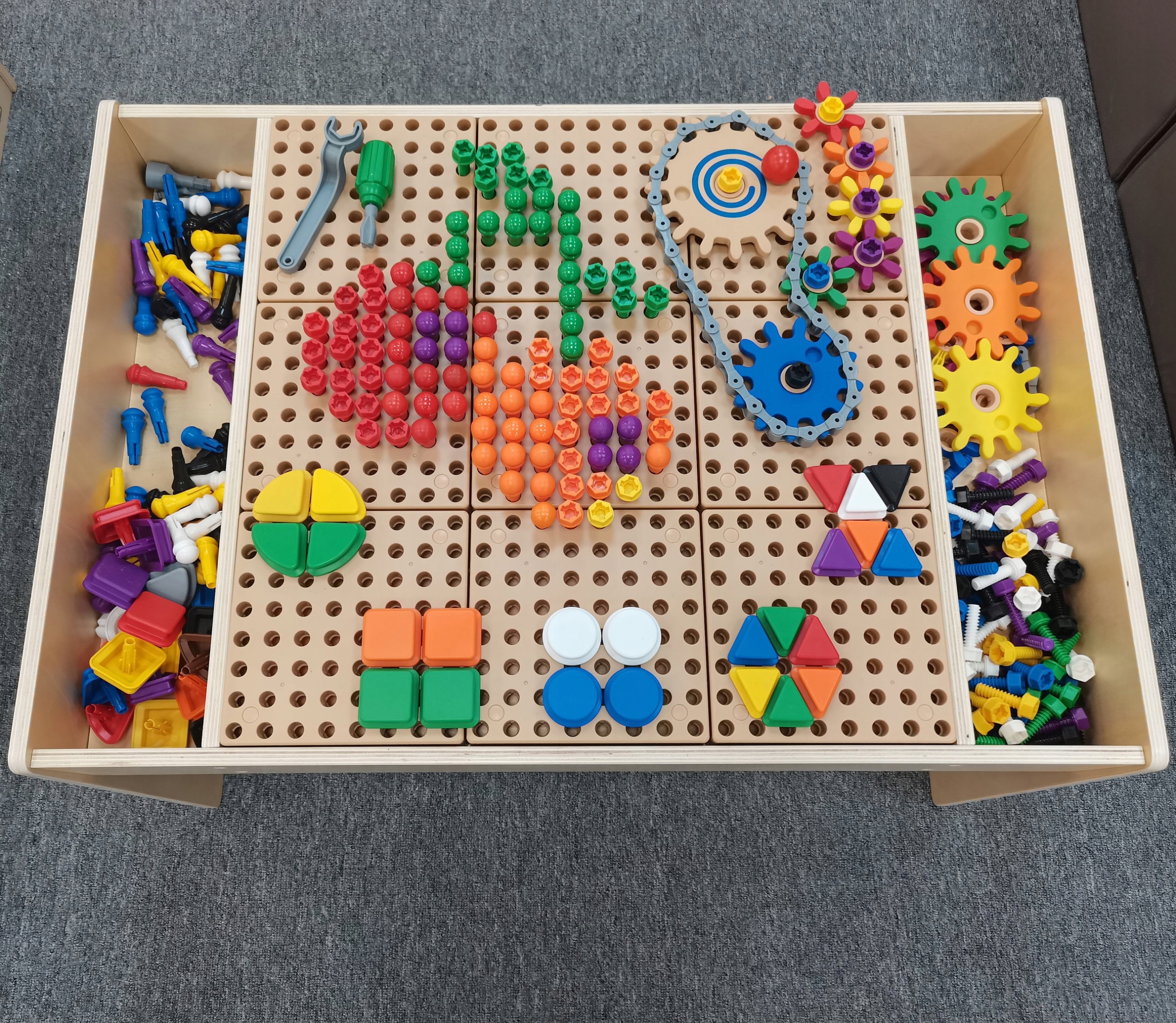 Обучающий стол Masterkidz STEM + Аксессуары позволяют творчески играть и исследовать мир науки. На панели размером 63 х 63 (см) есть отверстия, в которые можно создавать красивые узоры, вставляя красочные и геометрические булавки, винты, шестеренки.