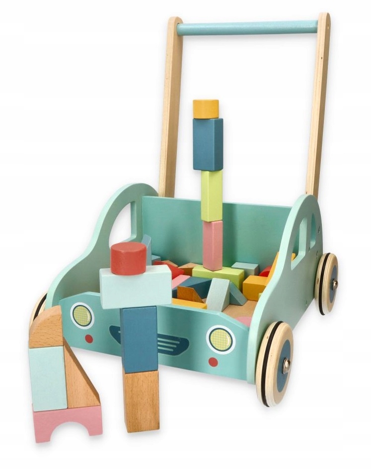 Тлельей был изготовлен так, чтобы форма напоминала автомобиль, даже спереди у нее нарисовали фары и бампер. Внутри, однако, вы можете найти целых 36 блоков в различных формах и цветах. Они будут прямоугольными, плоскими, в форме цилиндра, квадратного, треугольного или даже тех, у кого среза. Конечно, внутренняя часть тележки может использоваться вами по -другому. Вы можете нести своих любимых плюшевых друзей, куклов или чего -либо еще.