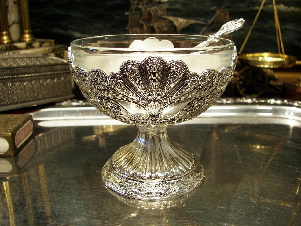Приглашаю Вас купить чудесную чашу или, возможно, чудесно декорированную сахарницу с мотивом, который ювелиры называют «филигрань». Разумеется, оригинальная филигрань состоит из соединенных между собой проволок. Все сделано из цветного металла, цинкового сплава. покрыта слоем серебра (ТАСЛИНА).Разнообразие декора делает изделие словно взятым из сказки тысячи и одной ночи. Этот предмет может иметь множество применений. Десерты, мороженое, фрукты, мед, сахар, да что угодно, стакан легко моется, а красота этой «чашки» поистине сказочна. Это может быть хорошей идеей в качестве оригинального подарка для кого-то особенного.