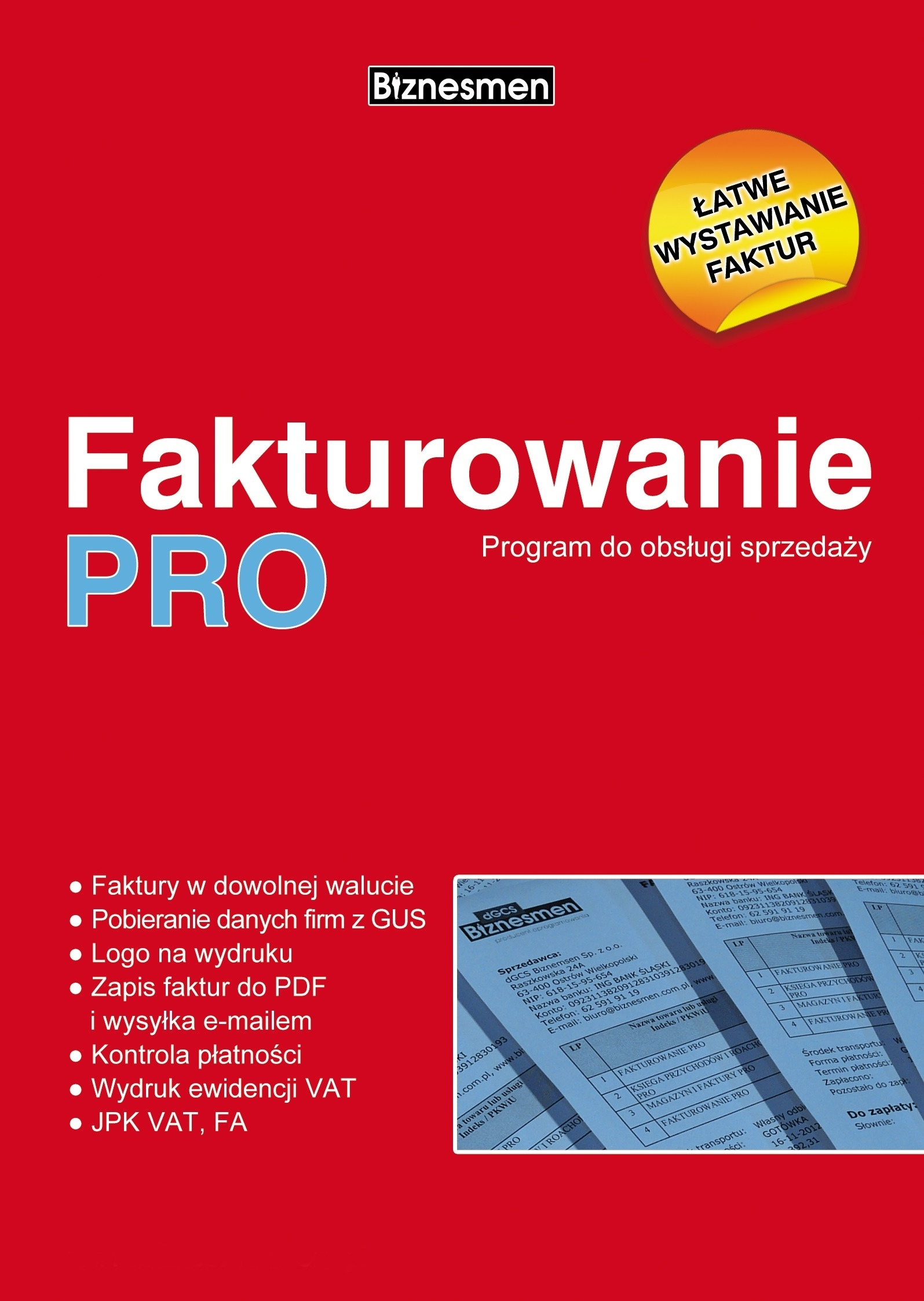Invoicing PRO — программа для оформления торговых документов на услуги и товары в любой валюте, в том числе: счета-фактуры, квитанции, авансовые счета, маржа, экспорт, WDT, относящиеся к товарам и услугам. Адресован компаниям, у которых нет необходимости контролировать запасы на складе. Оснащен множеством различных отчетов. Дополнительно имеет функции, позволяющие проверять своевременность платежей, контролировать остаток денежных средств в кассе и печатать банковские переводы. Это решение, предназначенное для небольших компаний любого профиля бизнеса.