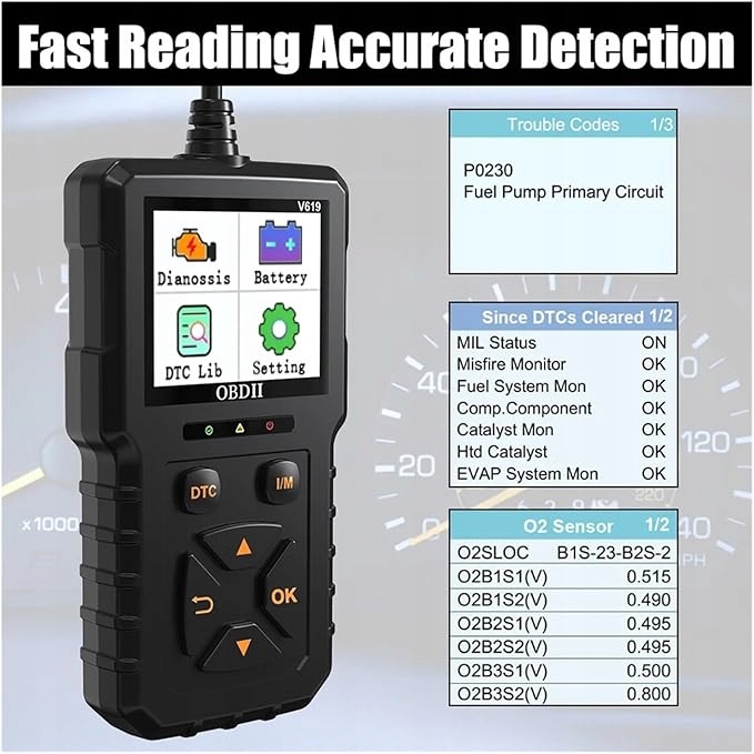- Кодовое чтение : отображать подробное описание кодов диагностических ошибок (DTC)