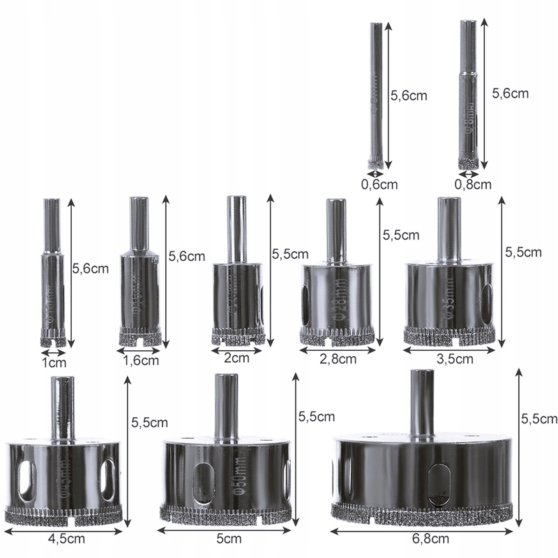 Набор из 10 алмазных отверстий для керамотиков, стекла, плитки h2> - 10 размеров в 1 b> - 10 отверстий в наборе. Каждый имеет свой размер: 6, 8, 10, 16, 20, 28, 35, 45, 50 и 68 мм. 6 мм, 8 мм, 10 мм используются для сверления отверстий для разъема: 16 мм для больших якорей и резьбовых стержней; 20 мм и 28 мм сделают отверстия под центральным нагреванием и центральным нагреванием. как радиаторы; 35 мм, 45 мм, 50 мм являются идеальным диаметром для подходов к воде и сточных водам; 68 мм является идеальным размером для электрических банок.