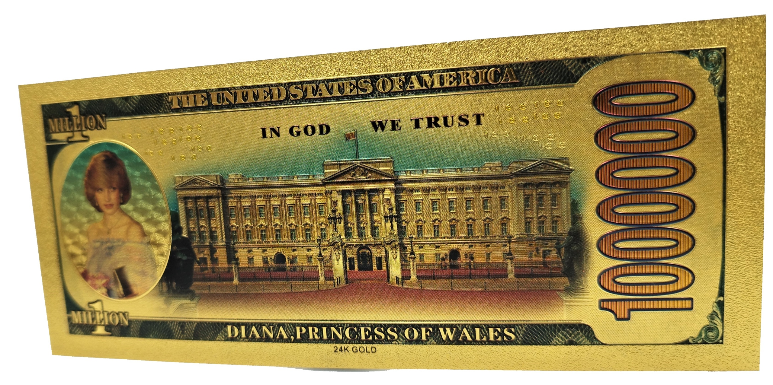 Красивая позолоченная коллекционная банкнота в 1 000 000 долларов с изображением принцессы Дианы Спенсер.