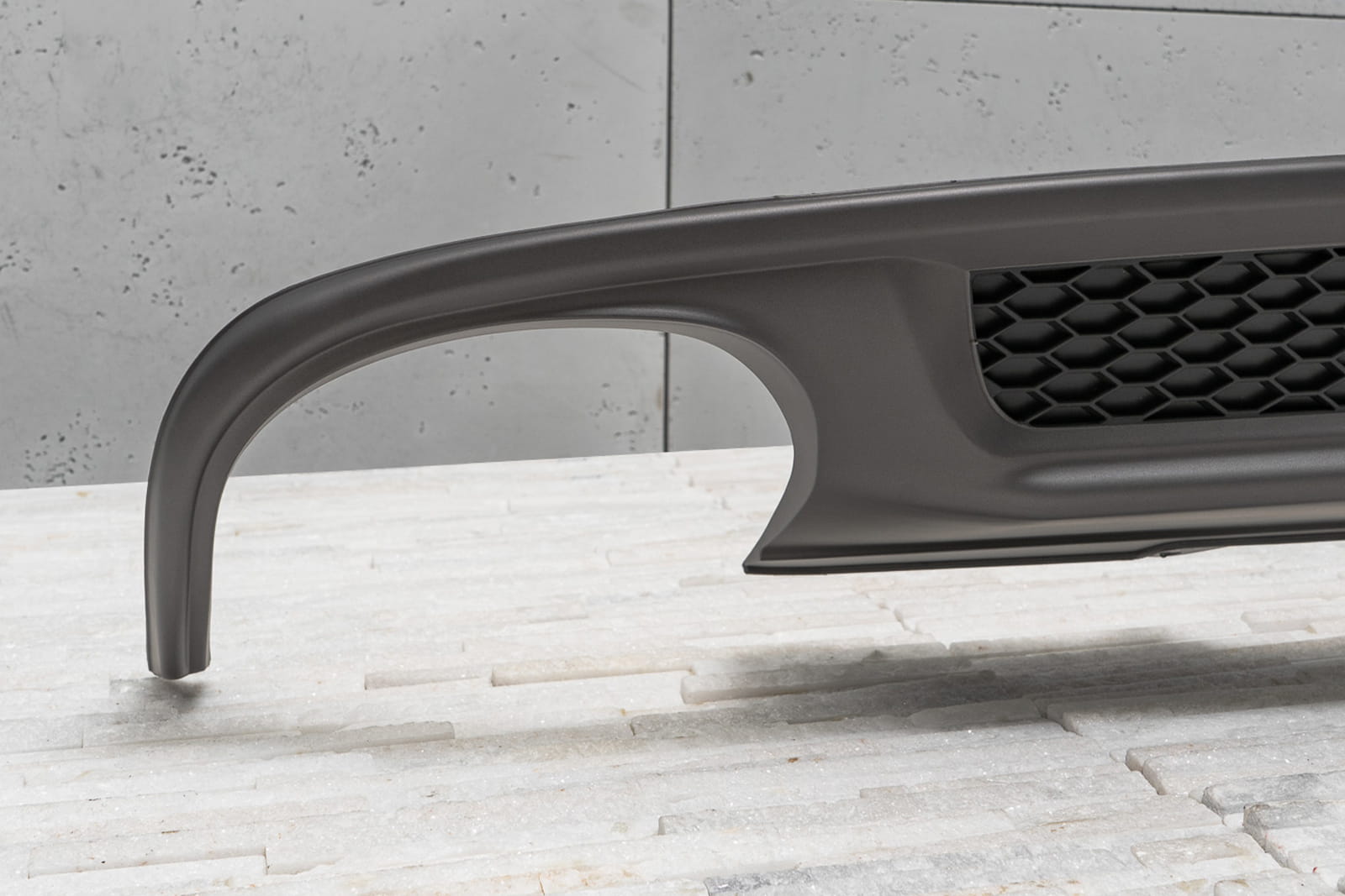 Характерный двойной выхлоп позволяет добиться стиля Audi A4 в версии S4. б> Диффузор был разработан так, чтобы идеально сочетаться с другими элементами отделки и подчеркивать динамичный и спортивный характер вашего автомобиля. Помимо визуальных преимуществ, диффузор улучшает аэродинамику автомобиля и снижает шум воздуха, проходящего под автомобилем. Изделие изготовлено из высококачественного автомобильного АБС-пластика антрацитового и черного цвета. Диффузор дополнительно украшен сотовой структурой, напоминающей спортивные автомобили. В комплект входят элементы крепления. Диффузор является запчастью, совместимой с местом крепления в заднем бампере автомобиля. Для установки элемента. вам необходимо снять губу бампера, а затем заменить ее диффузором для укладки.