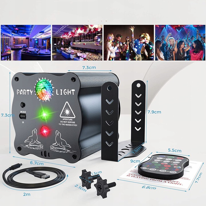 Светильник для дискотек Party Lazer Lights имеет корпус из высококачественного алюминиевого сплава, поставляется с монтажными аксессуарами, его можно разместить на столе или на земле, или даже закрепить на потолке или просто поставить на землю. В руководстве четко описаны параметры пульта дистанционного управления и различные настройки. Установить этот диджейский светильник очень легко менее чем за 2 минуты.