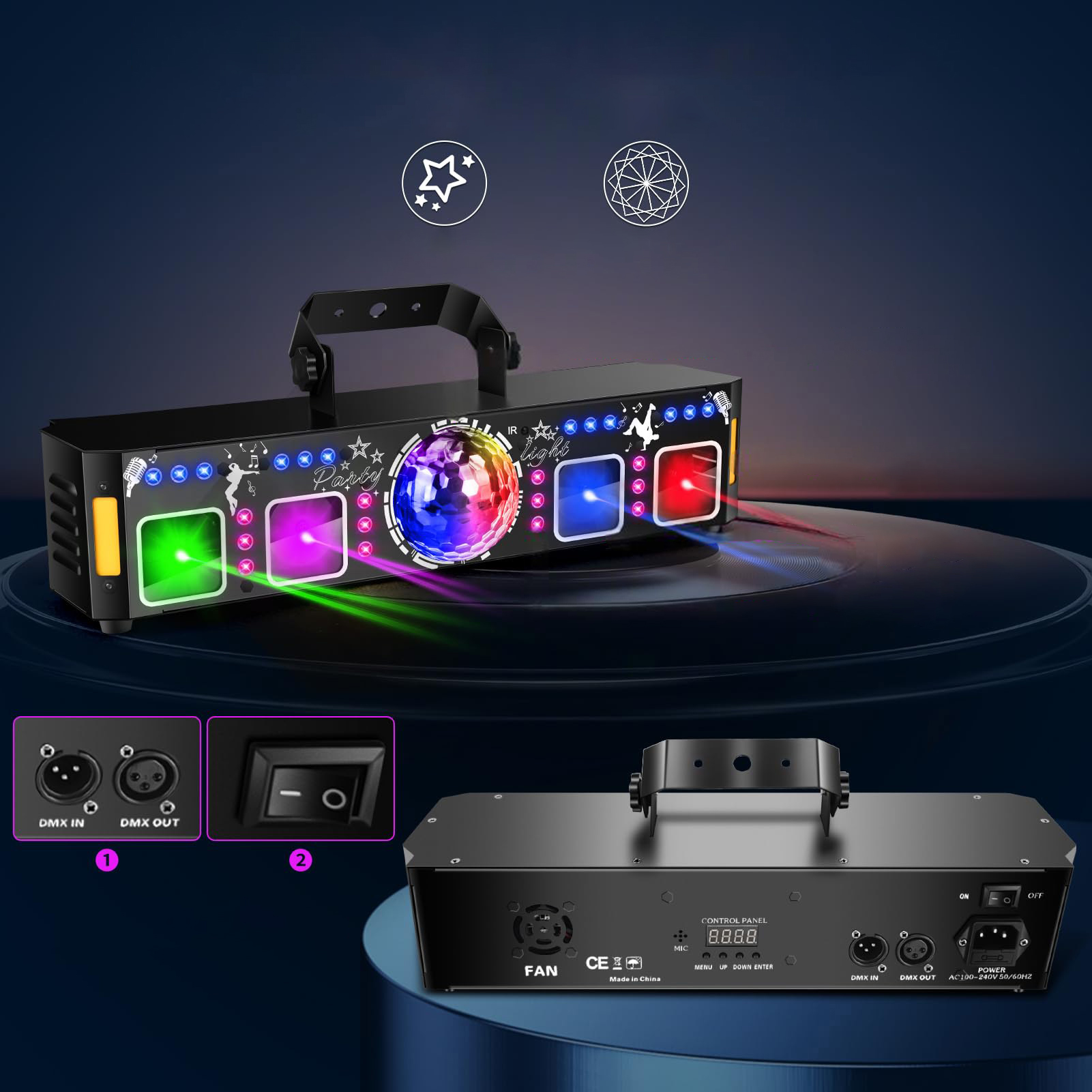 3. Использование 9 сильных источников света типа PA Light «Три в одном» и мощные светодиоды в качестве фона окрашивания, подключенные к 7-цветным фонам раскраски, которые также можно использовать в качестве светодиодной строки.
