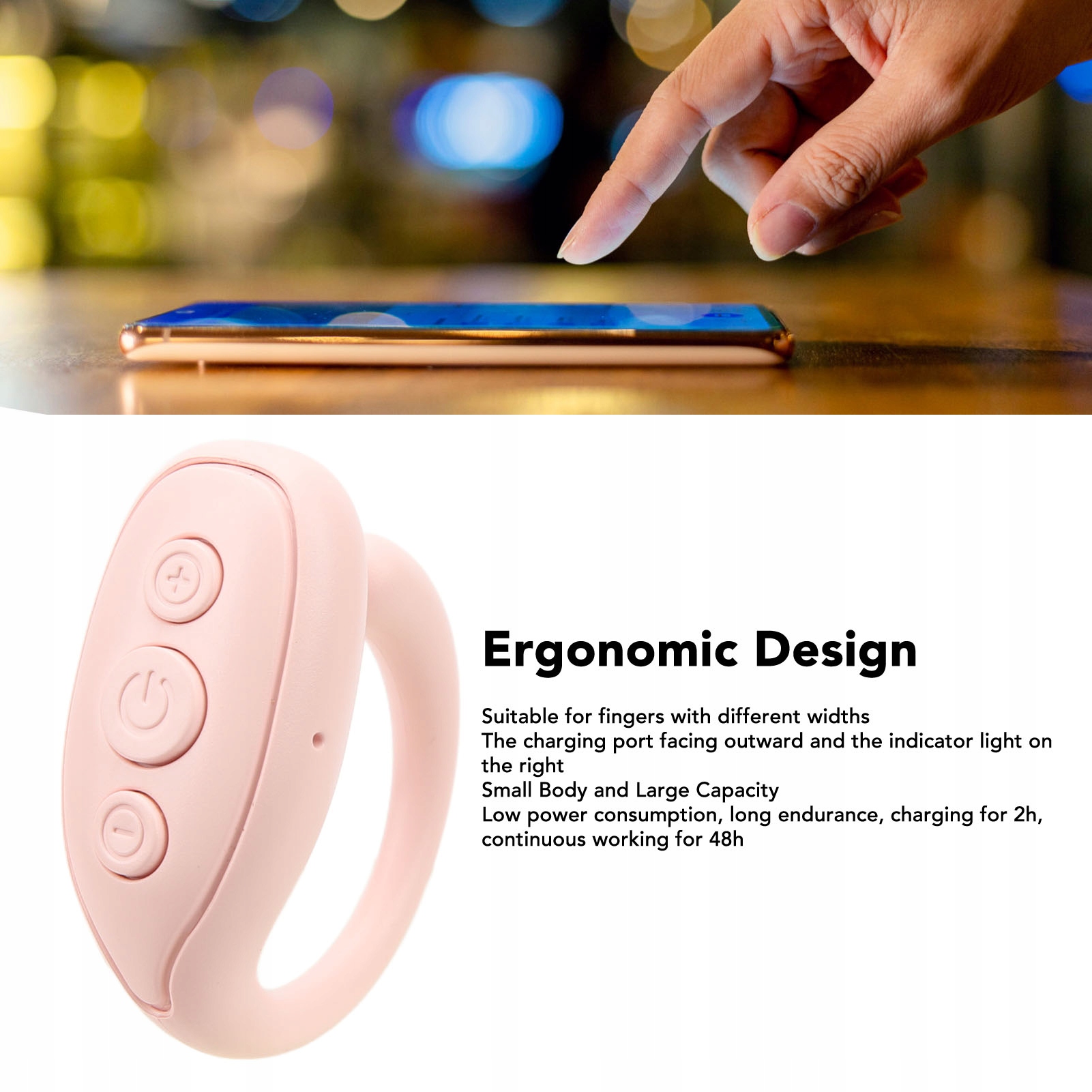 Функция: 1. Эргономическая конструкция: Кольцо дистанционное управление эргономично спроектировано, подходит для пальцев разной ширины, с зарядным портом, обращенным внешним и управляющей лампой справа.