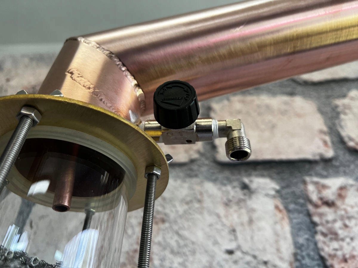 Для облегчения контроля воды и ее точной настройки на входе воды в дистиллятор (в самом низу охладителя) имеется дополнительный вентиль. Благодаря этому нет необходимости манипулировать внешним краном подачи воды.