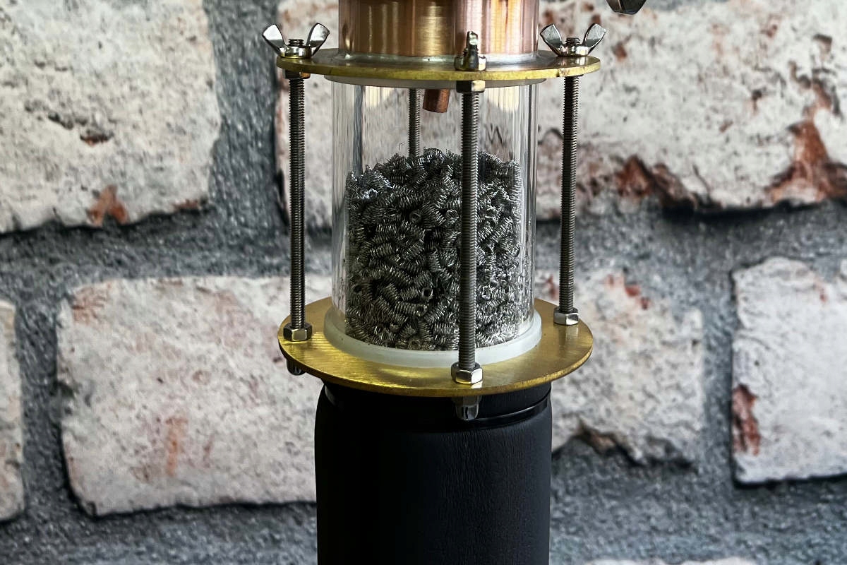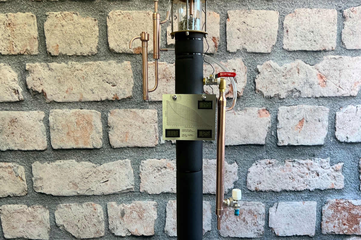 Колонна — самый важный элемент, «сердце» дистиллятора. Это медь, потому что лучшие дистилляты делаются в медных аппаратах. Медь является активным ингредиентом и оказывает непосредственное влияние на дистиллят – очищает его, улавливает, например, неблагоприятные соединения серы.