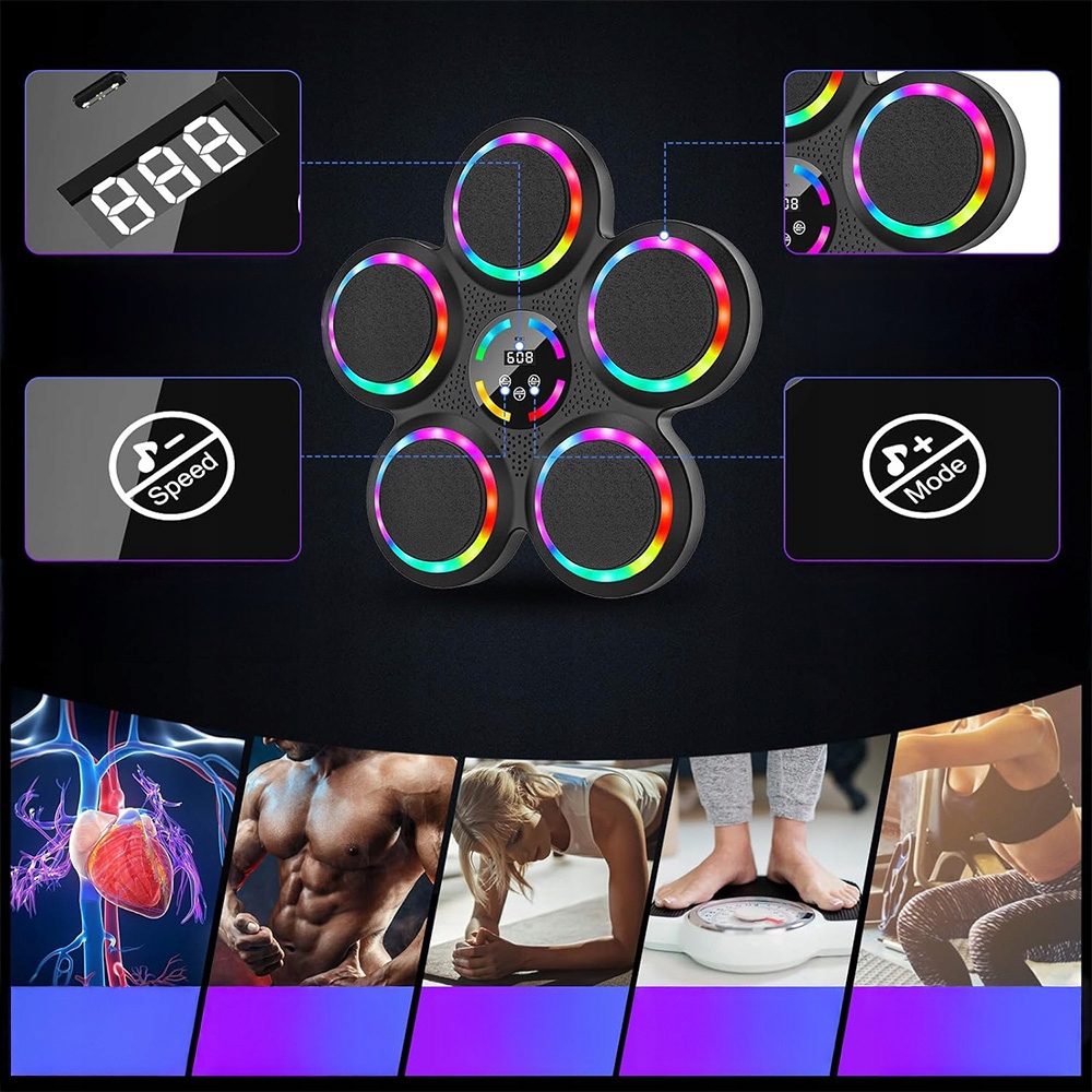 . Машина машина оснащена 9 режимами, 9 скоростями и функцией подсчета для удовлетворения потребностей большинства людей. Упражнение для ударов может улучшить скорость реакции и координацию тела. Boxing Machine - это идеальное оборудование для обучения по боксу и для повседневной тренировки для профессиональных боксеров, людей фитнеса, людей на диете, детей, подростков и т. Д. Интеллектуальная музыкальная коробка для взрослых поддерживает музыку Bluetooth. Вы можете выбрать свои любимые песни во время обучения по боксу. Пространственные динамики и эффективное освещение позволят вам полностью посвятить себя тренировкам.